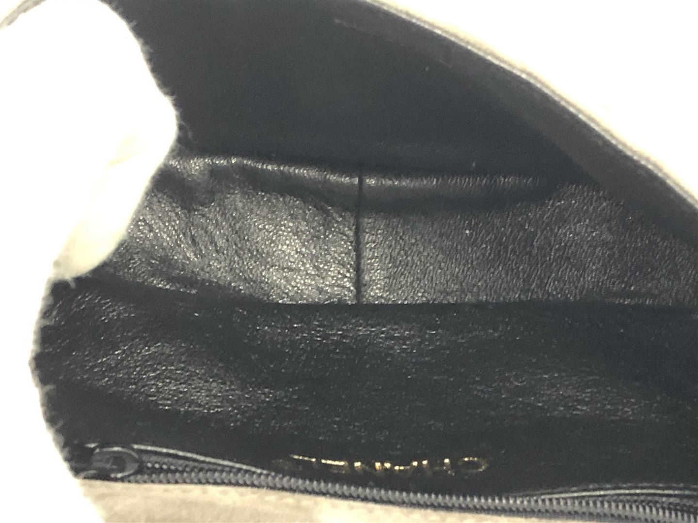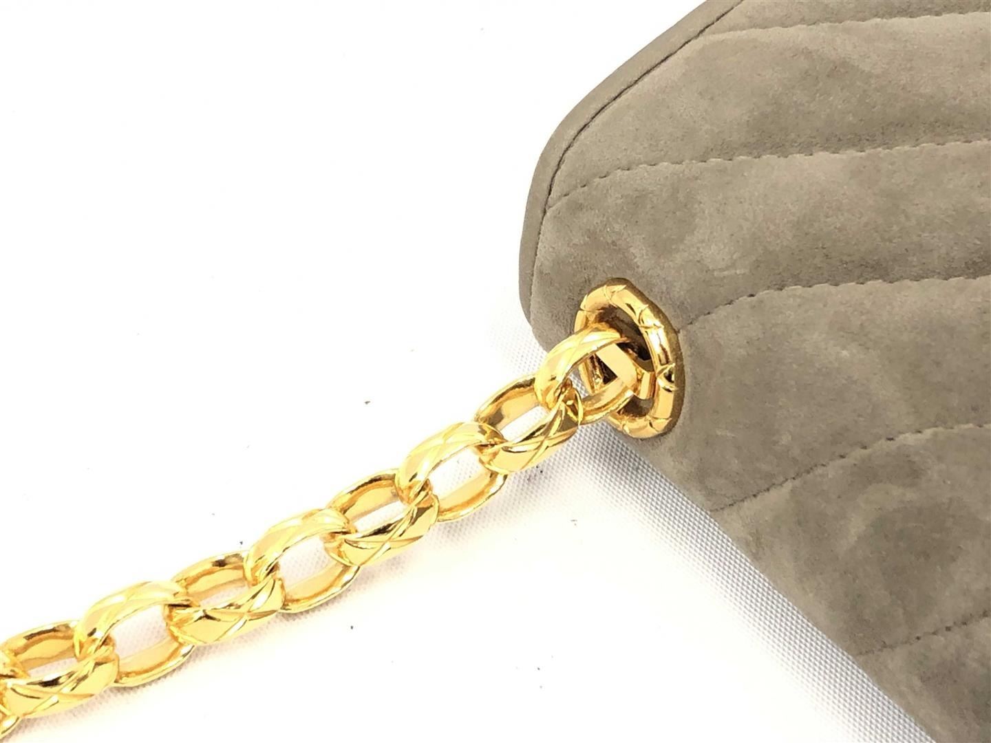 Chanel Double Flap Chevron Shoulder Bag features gray suede exterior, black leather interior, gold-tone chain link strap and closure adorned with multicolor stones. 6 6.7" x 3. 10. 17 cm x 8.5 cm x