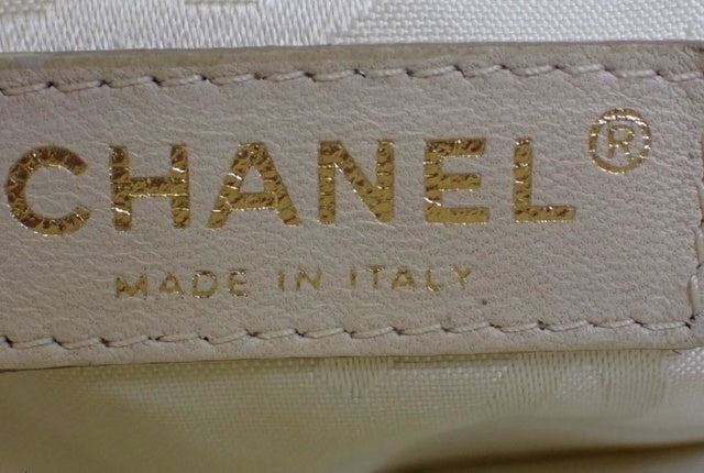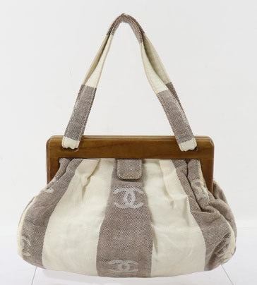 Chanel shoulder bag in grey and ivory striped linen and a wooden frame opening. This bag has a cute beach/nautical themed design with a wooden frame opening that can be pulled open with tabs on the front and back of the bag. The linen has large CC logos w