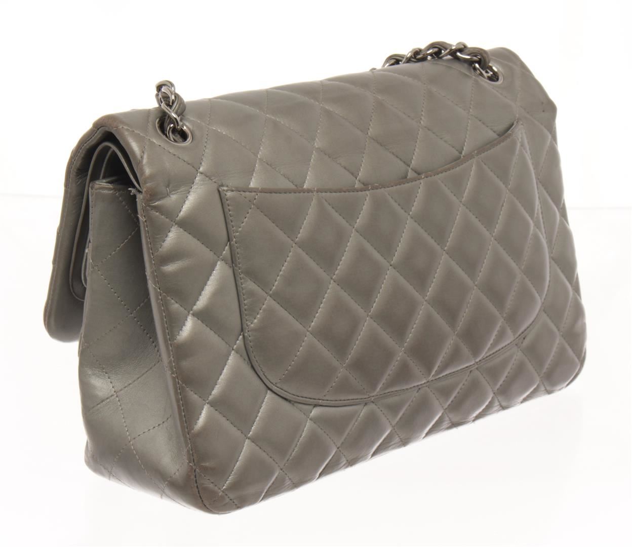 Chanel Grey Leather Large Double Flap Shoulder Bag. All available information is listed in the description and shown in the photos. chanel grey leather large double flap shoulder bag with lambskin leather and has a soft metallic finish, it opens up to 2 compartments, one of which has different side pockets, there is another pocket in the back of the flap bag. Height: 16 cm (6.3 in), Width: 26 cm (10.24 in), Depth: 8 cm (3.15 in)