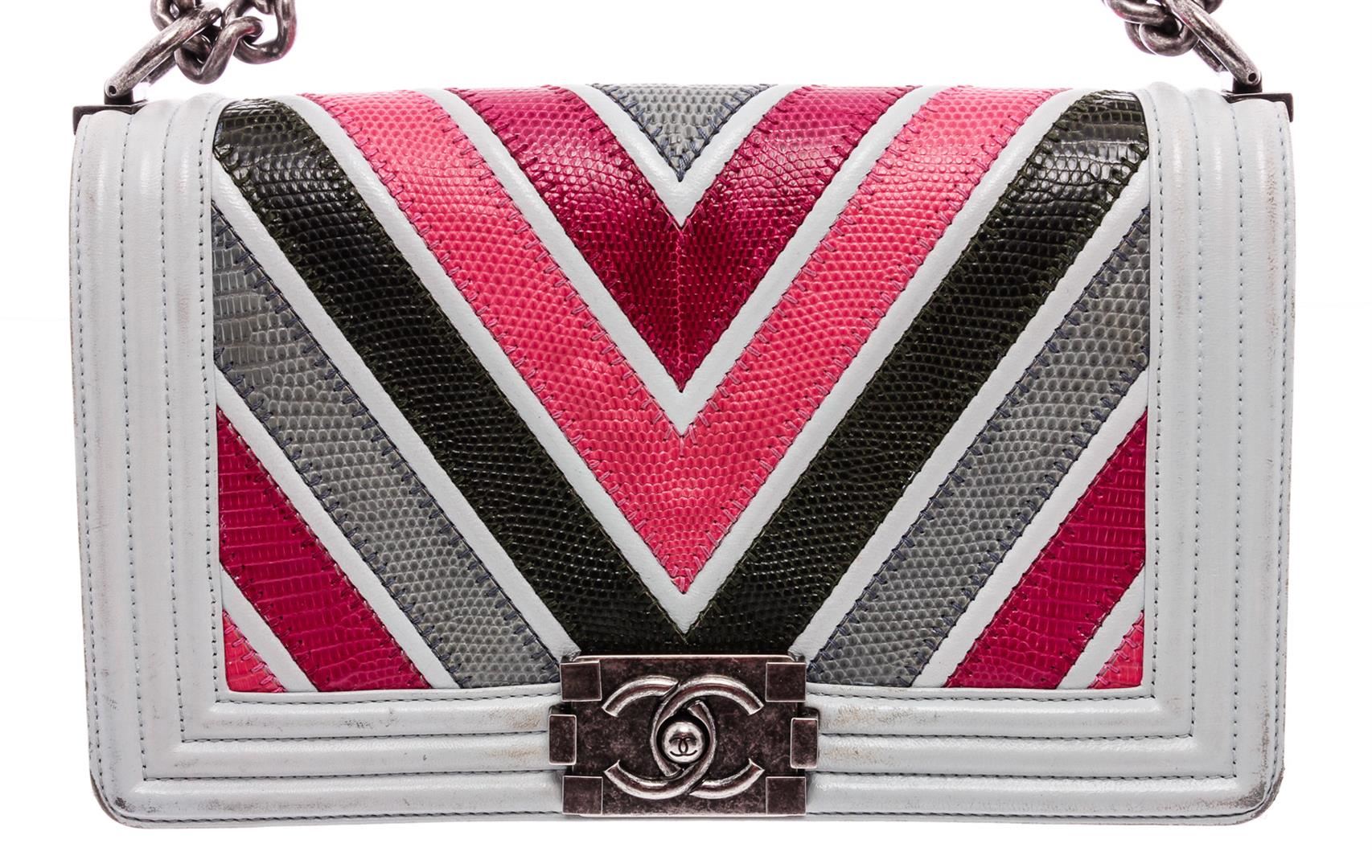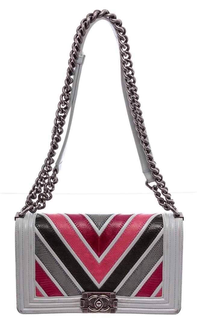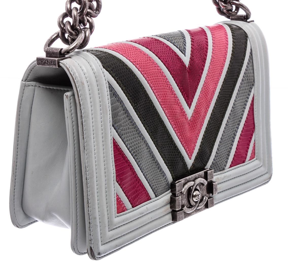 Pink and multicolor chevron quilted lizard Chanel Medium Boy Bag with antiqued ruthenium hardware, convertible chain-link shoulder strap with leather shoulder guard, light blue lambskin trim, black leather interior, single slit pocket at interior wall and CC push-lock closure at front flap.