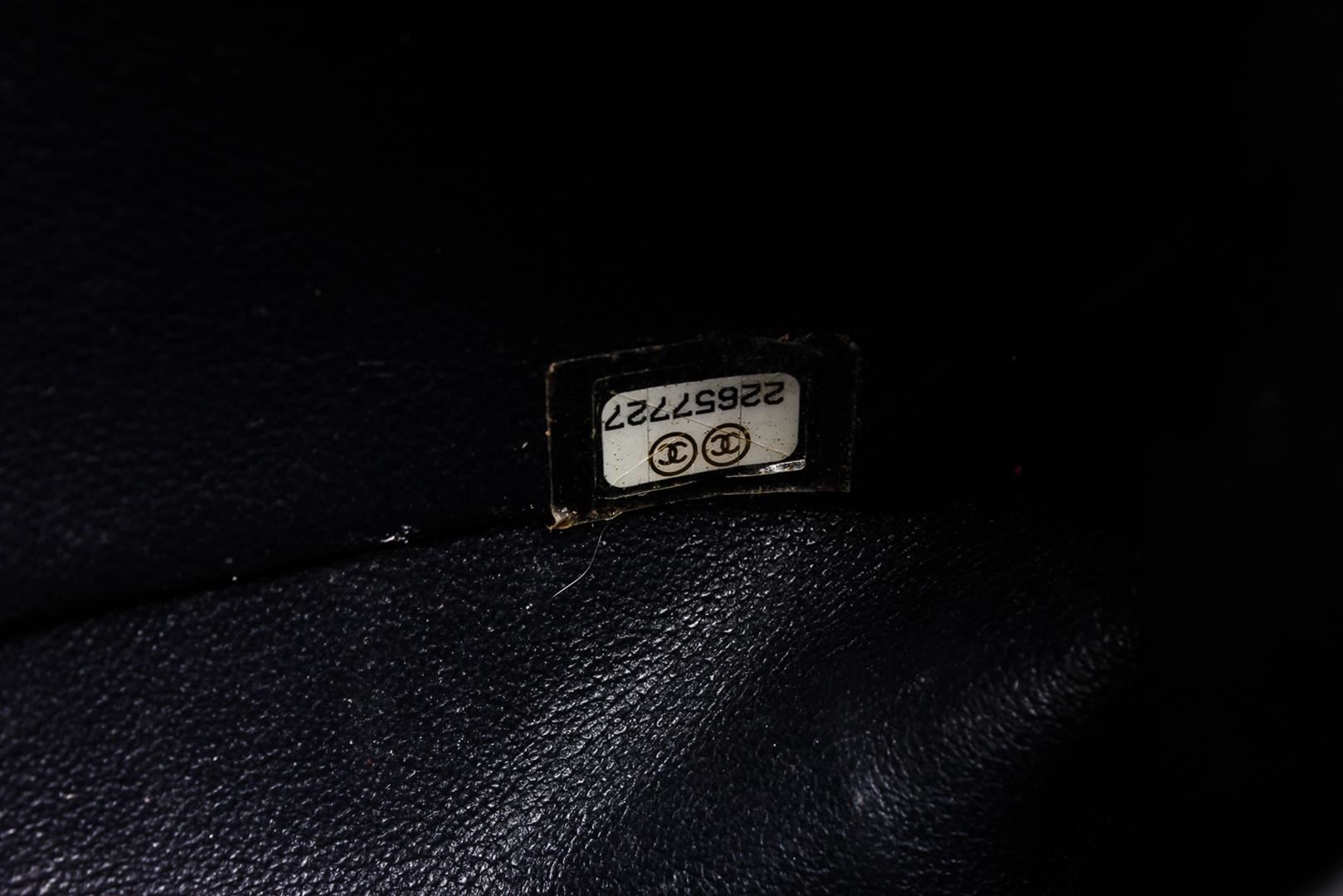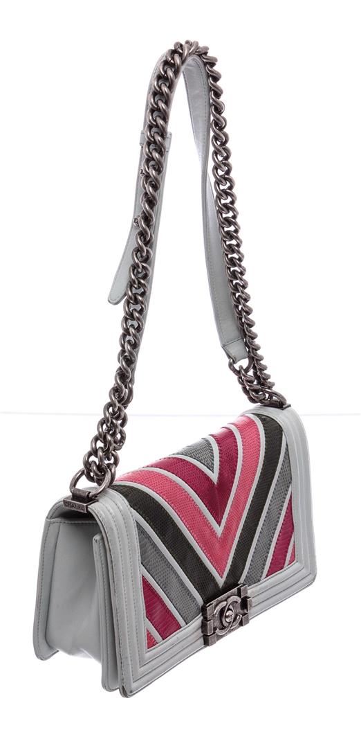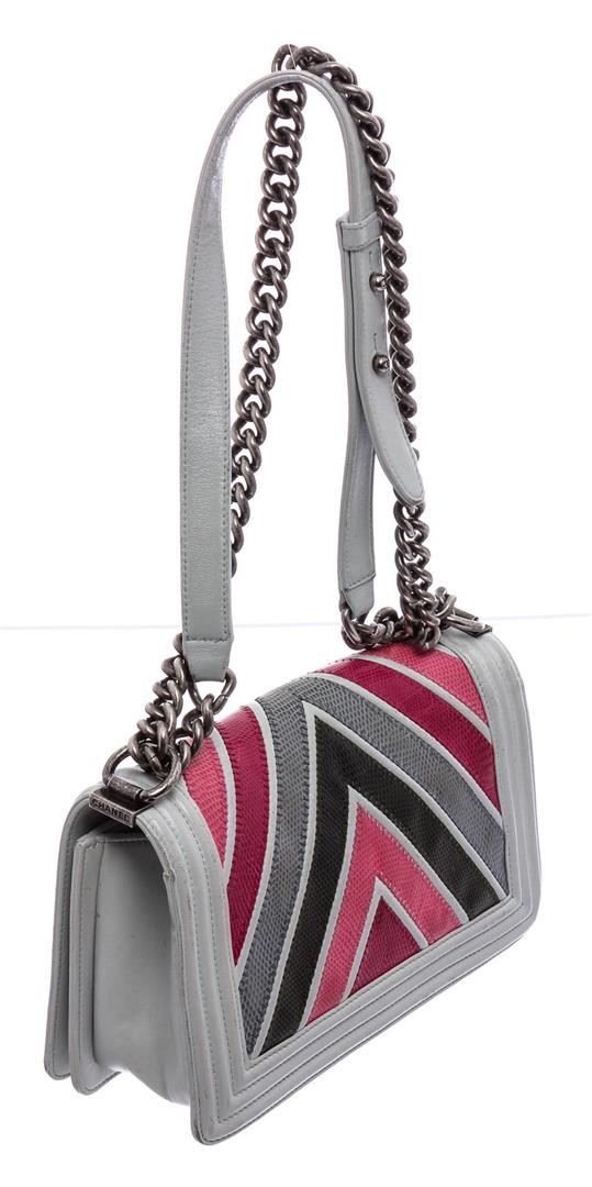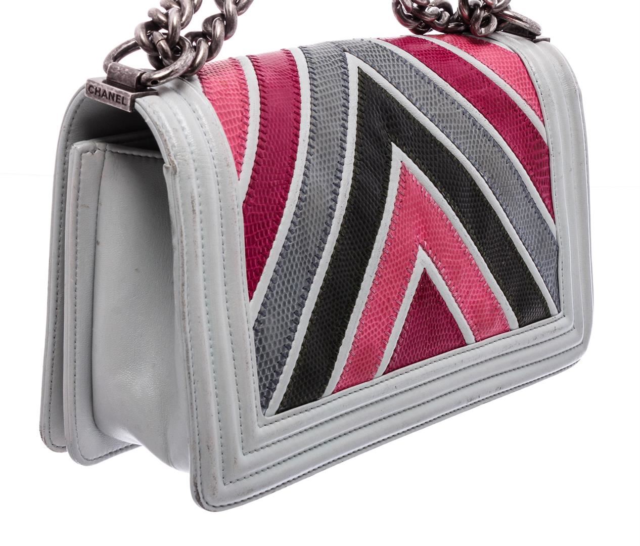 Pink and multicolor chevron quilted lizard Chanel Medium Boy Bag with antiqued ruthenium hardware, convertible chain-link shoulder strap with leather shoulder guard, light blue lambskin trim, black leather interior, single slit pocket at interior wall and CC push-lock closure at front flap.