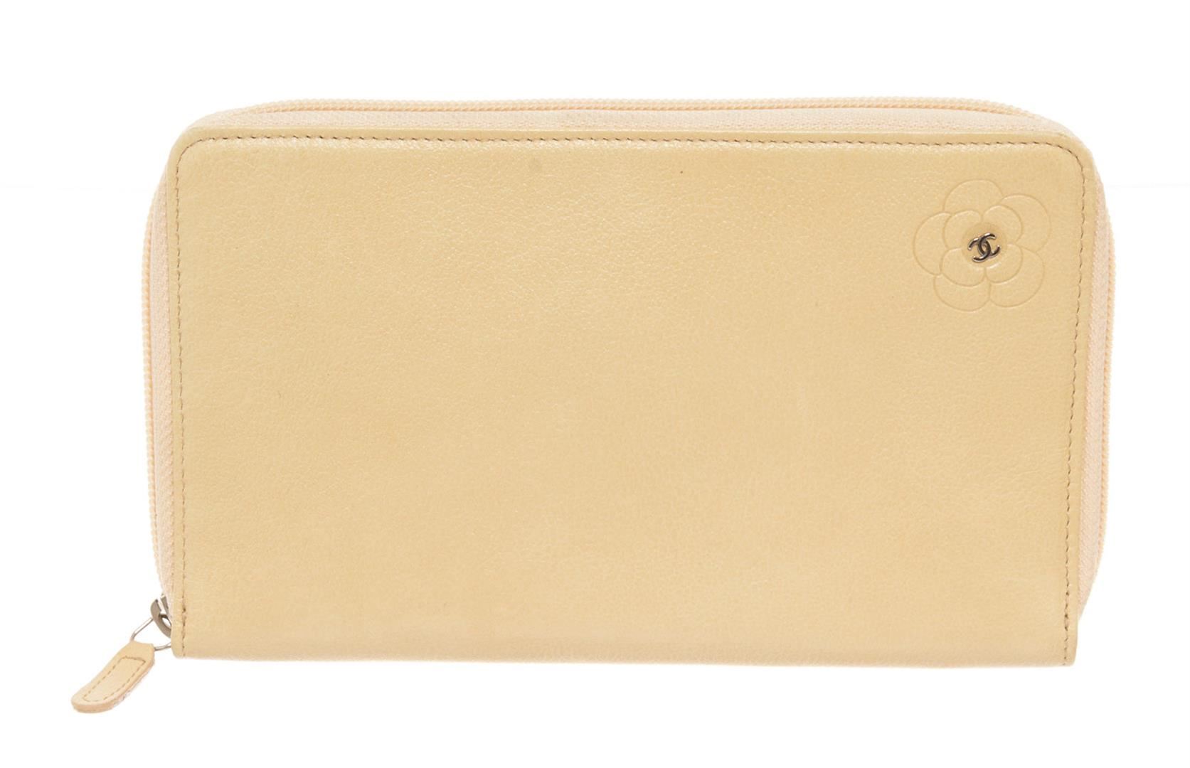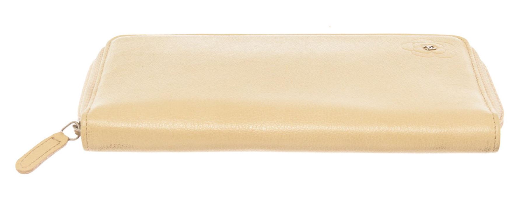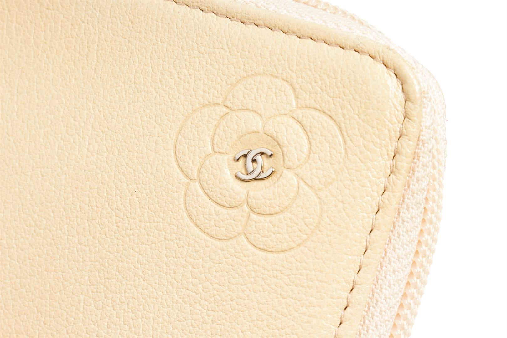 Chanel Camellia Zip Around Long Wallet features ivory leather body with engraved Camellia flower and interlocking CC logo at the center, silver-tone hardware, zipper around the main compartment, one internal zipped pocket, eight card slots and ivory leath