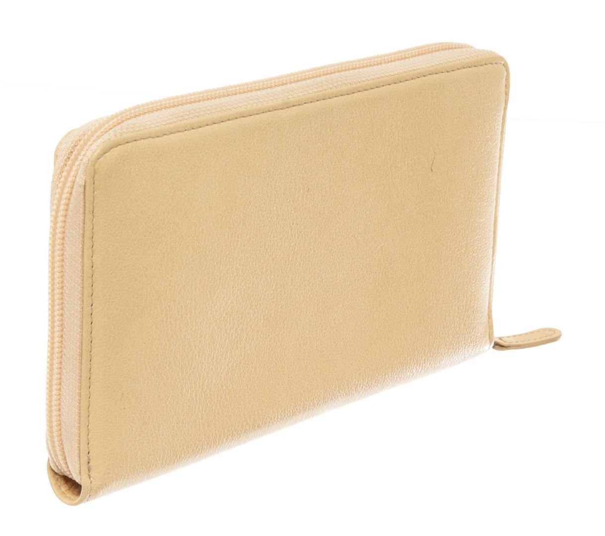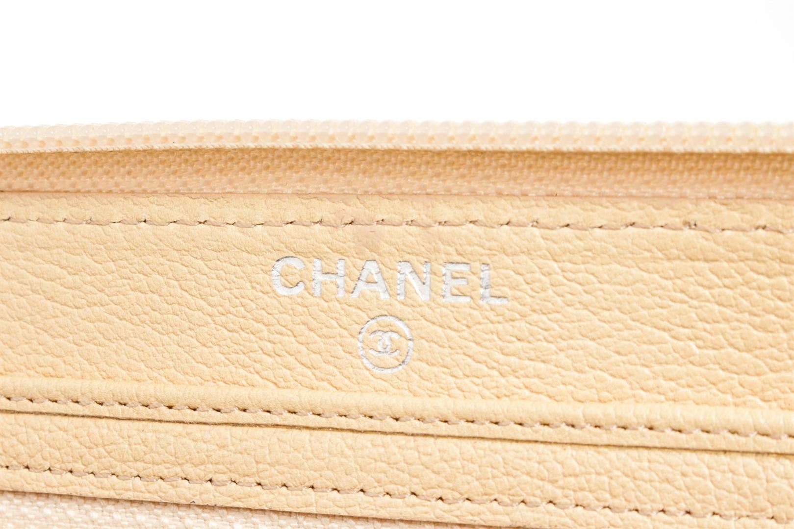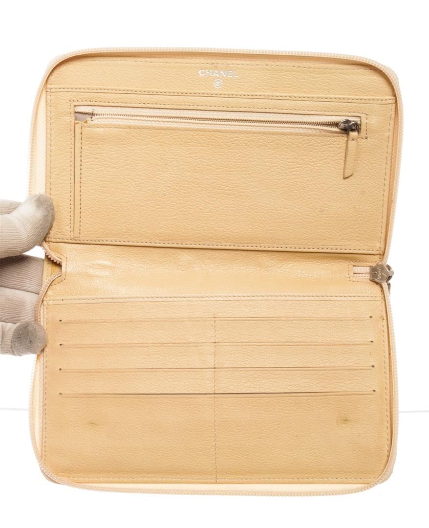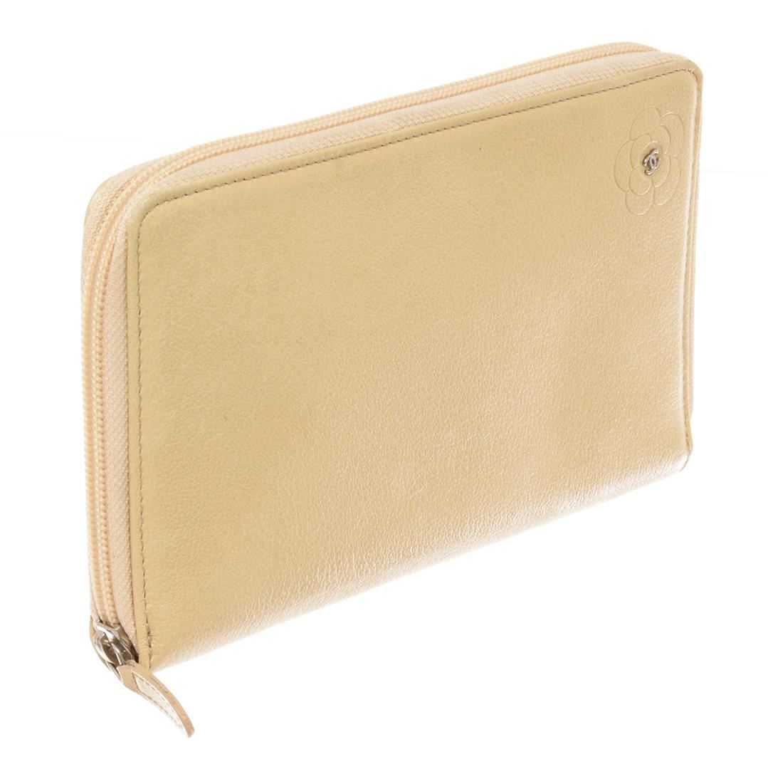 Chanel Camellia Zip Around Long Wallet features ivory leather body with engraved Camellia flower and interlocking CC logo at the center, silver-tone hardware, zipper around the main compartment, one internal zipped pocket, eight card slots and ivory leath