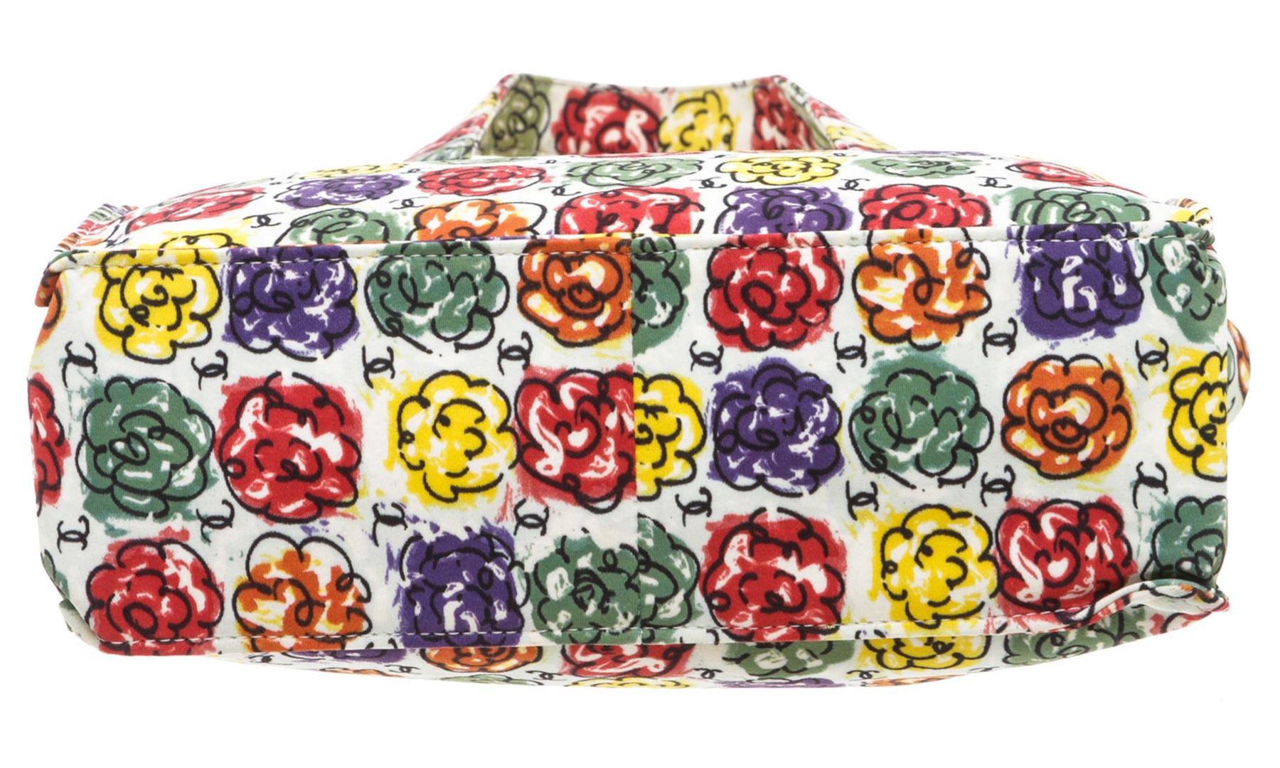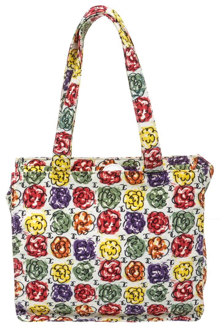 One Chanel Ivory Multicolor Floral Print Camellia Tote Bag. Ivory and multicolor floral print nylon Chanel Camellia tote with silver-tone hardware, dual flat shoulder straps, ivory grosgrain lining, single interior slip pocket and zip closure at top. MKR