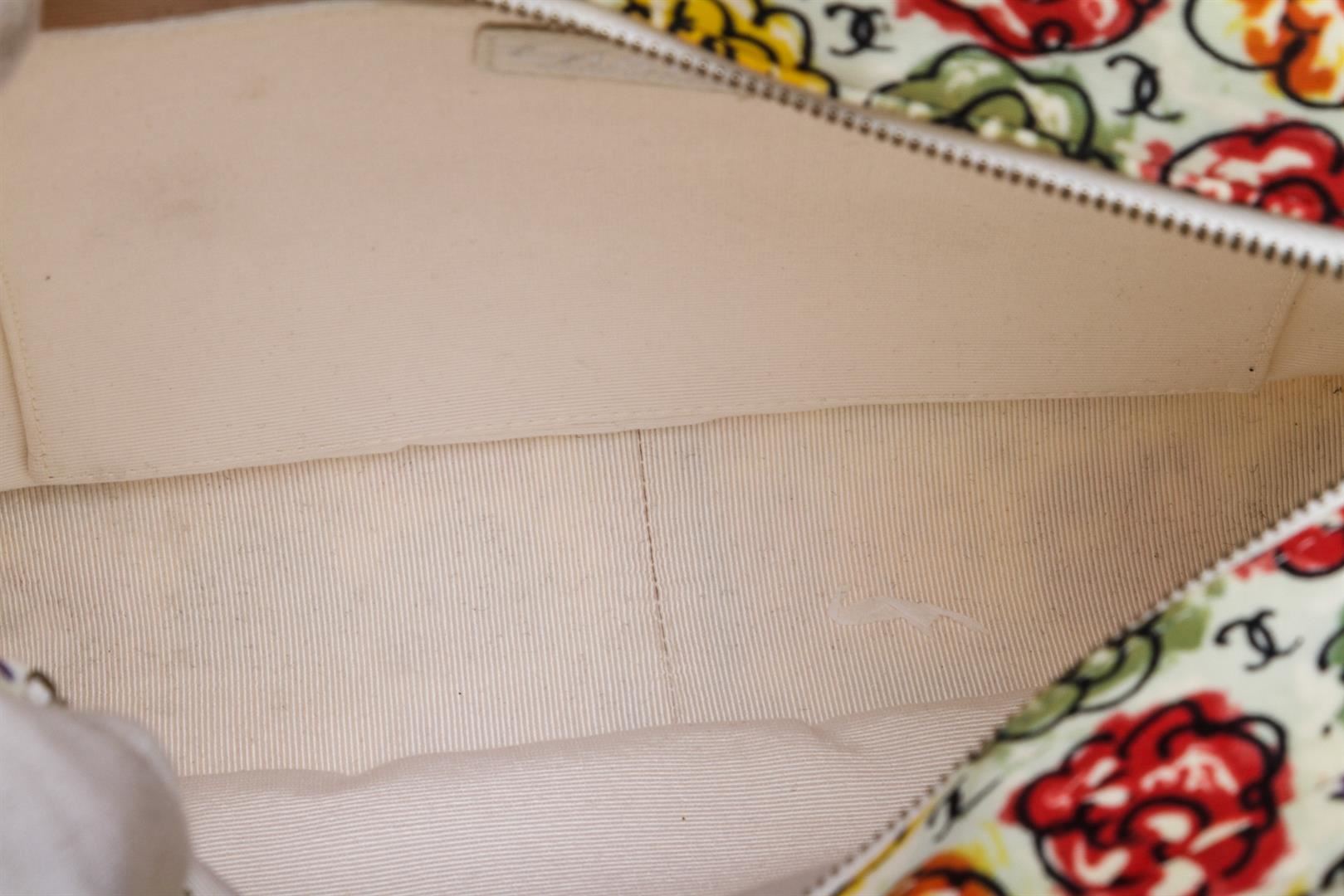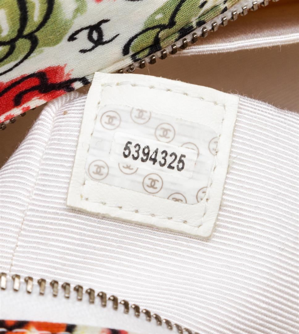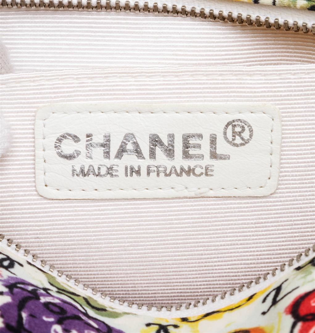 One Chanel Ivory Multicolor Floral Print Camellia Tote Bag. Ivory and multicolor floral print nylon Chanel Camellia tote with silver-tone hardware, dual flat shoulder straps, ivory grosgrain lining, single interior slip pocket and zip closure at top. MKR