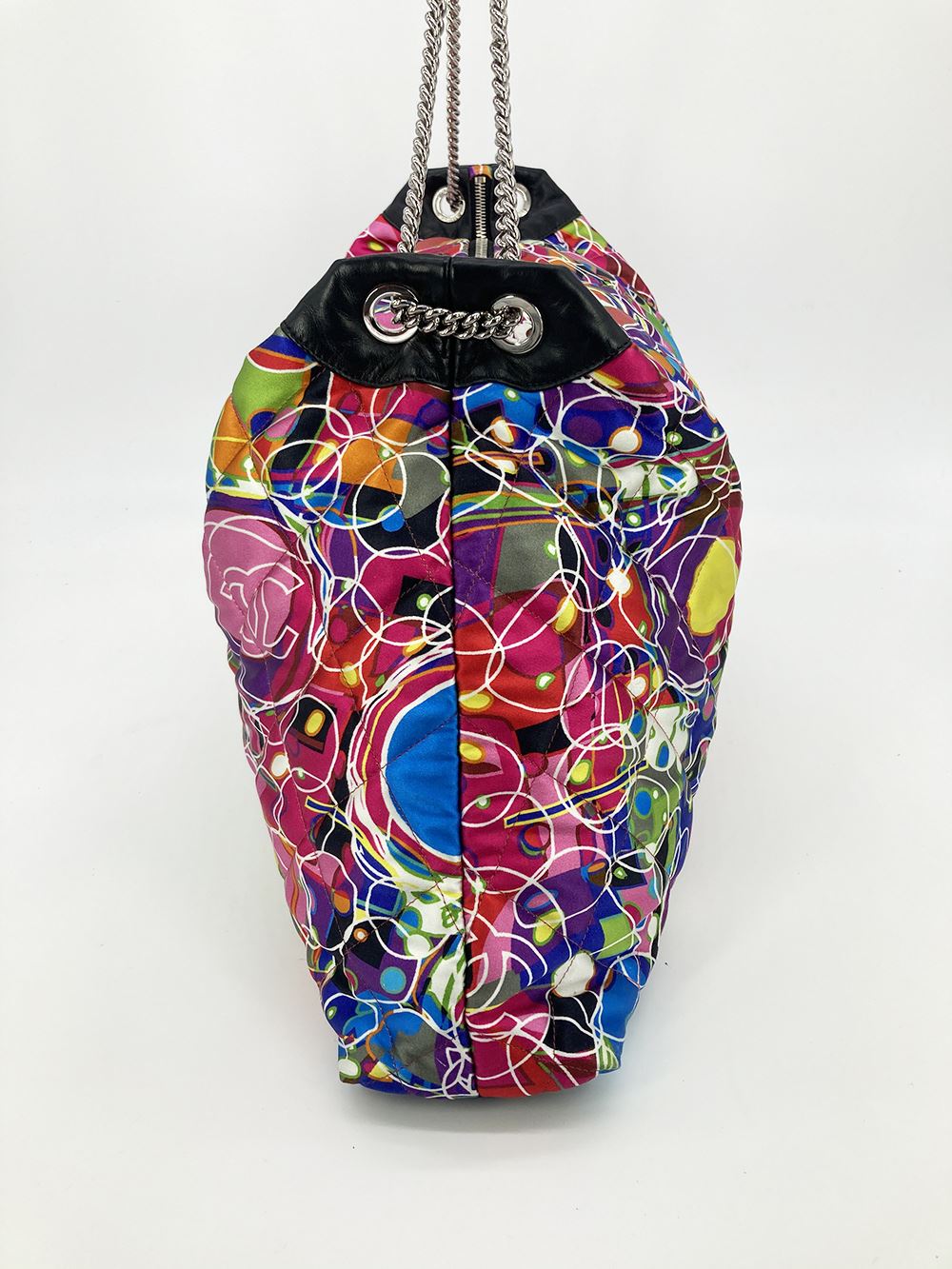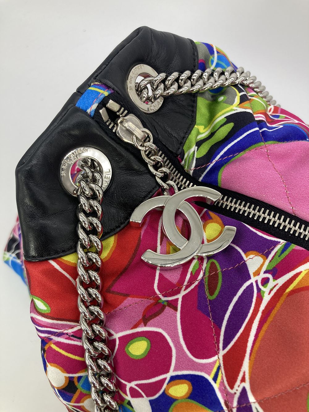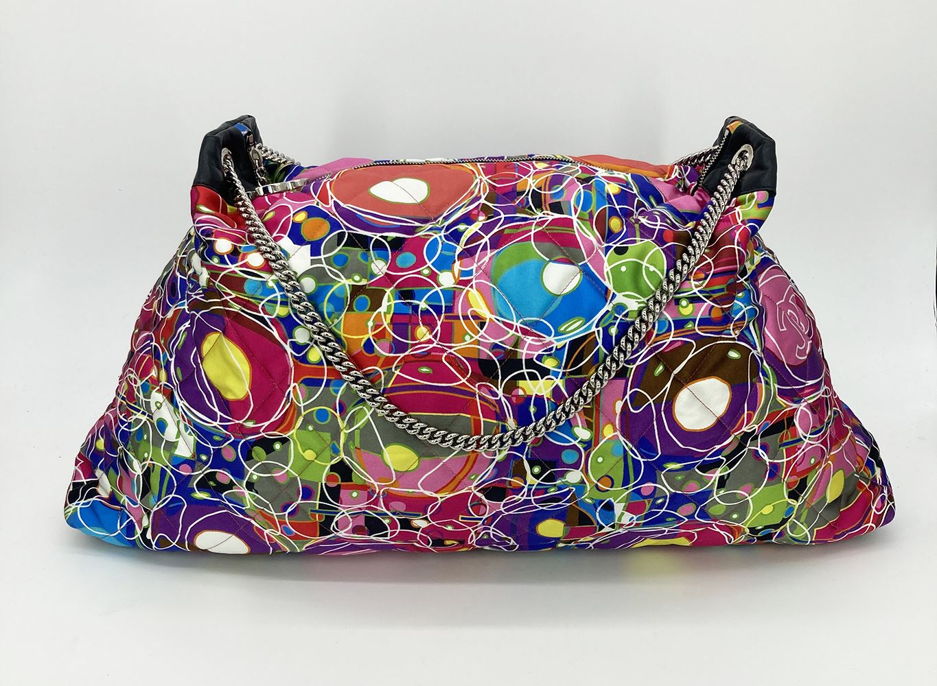 Chanel Kaleidoscope Bag in excellent condition. Multi color quilted silk exterior with unqiue and limited edition kaleidoscope bubble circle print throughout. Silver hardware and black leather trim. Chain shoulder strap can be worn short (doubled) or long (singled). Top full zipper closure opens to a black satin interior with ample storage space and features one zip and 2 slit side pockets and attached leather key strap. overall excellent condition. clean silk, corners edges and interior. no stains smells or fabric pulls. rare limited edition piece perfect for brightening any wardrobe. purchase includes care booklet, authenticity card and dust cover. measurements: 24"x12"x8" 10-17" strap drop #Bags3014