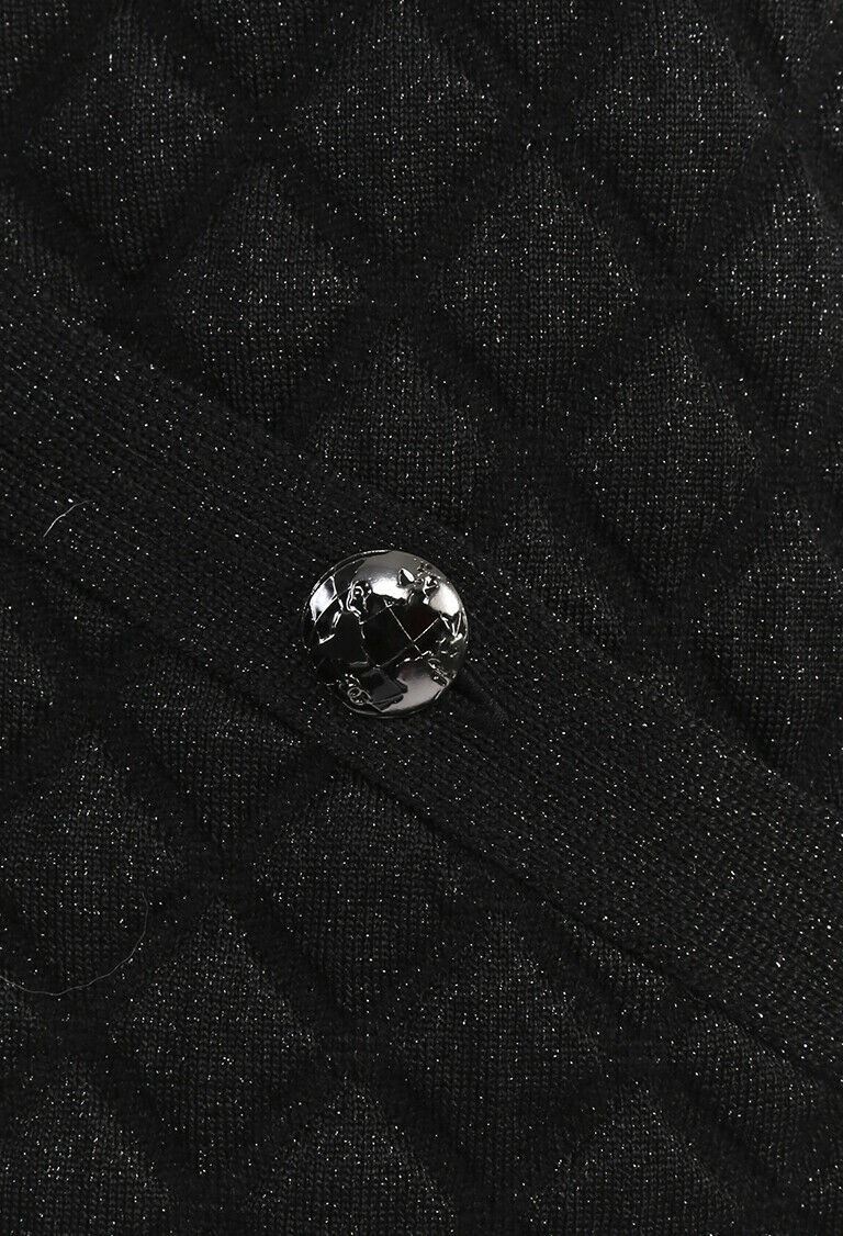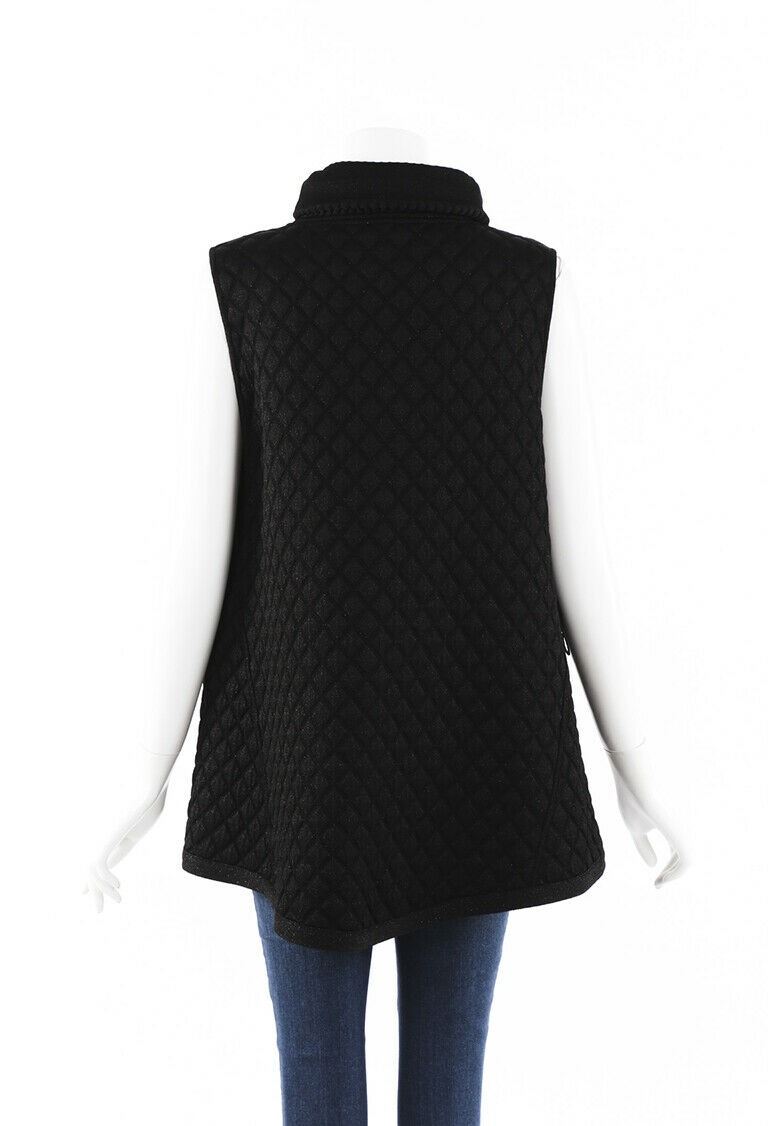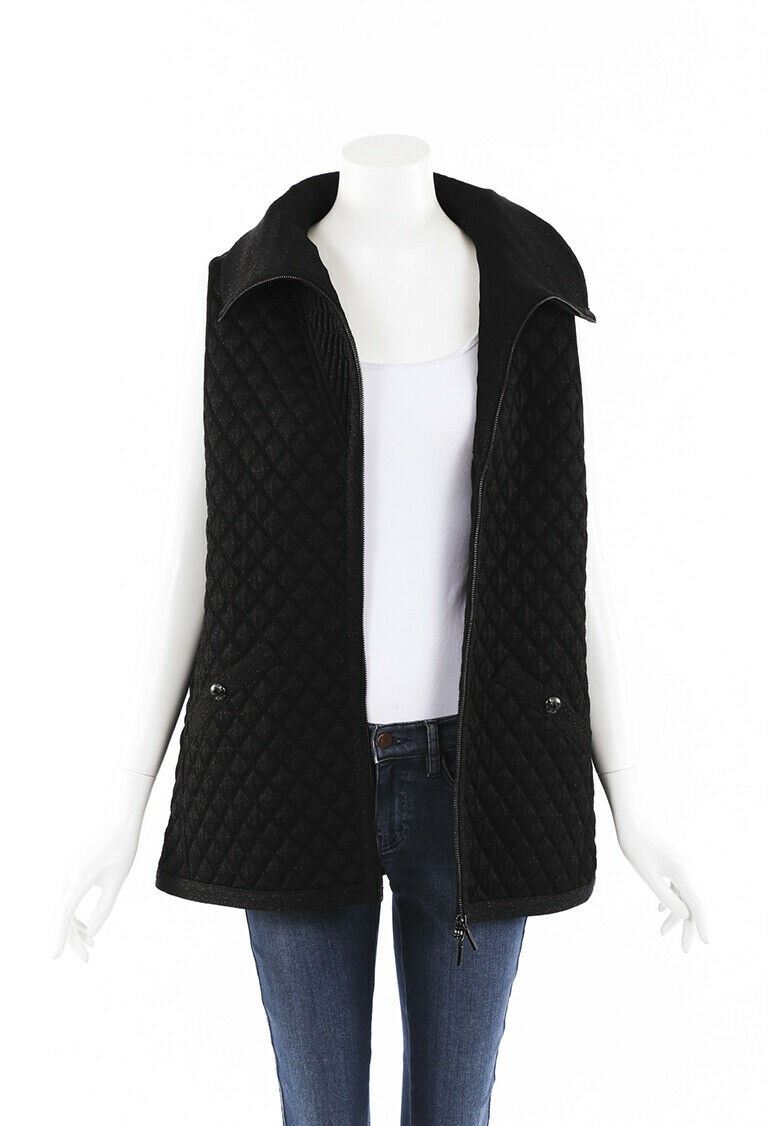 Circa 2013. Chanel glitter quilted wool blend knit vest features a funnel neckline, pockets with CC globe buttons, and a front zip closure. Unlined.
