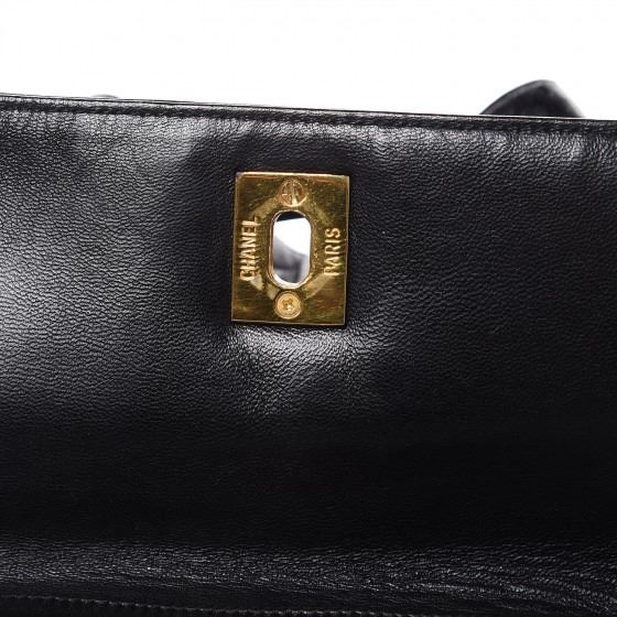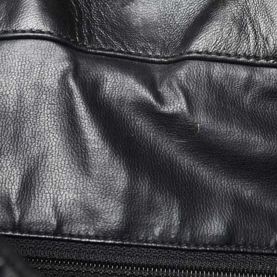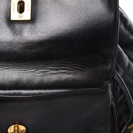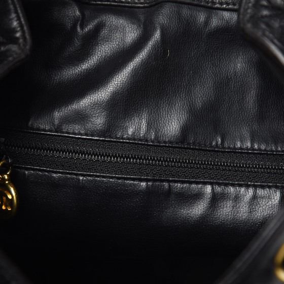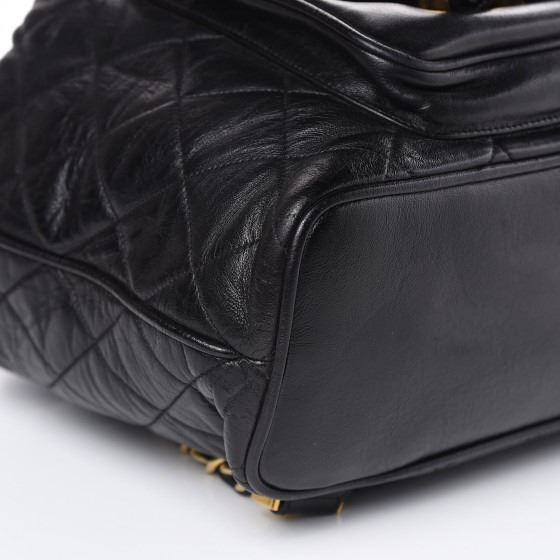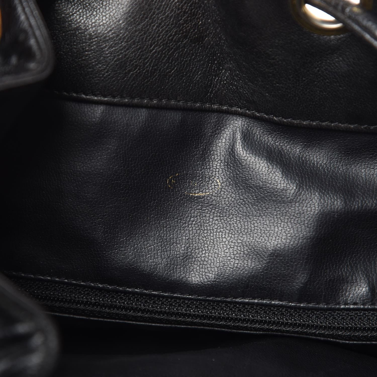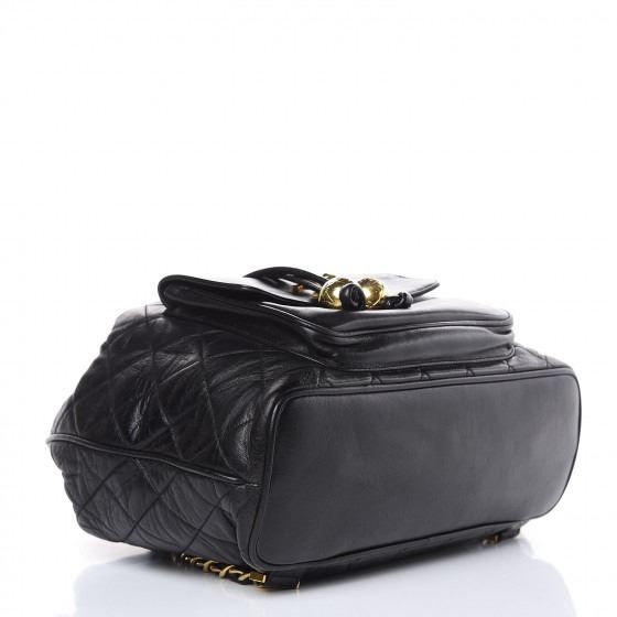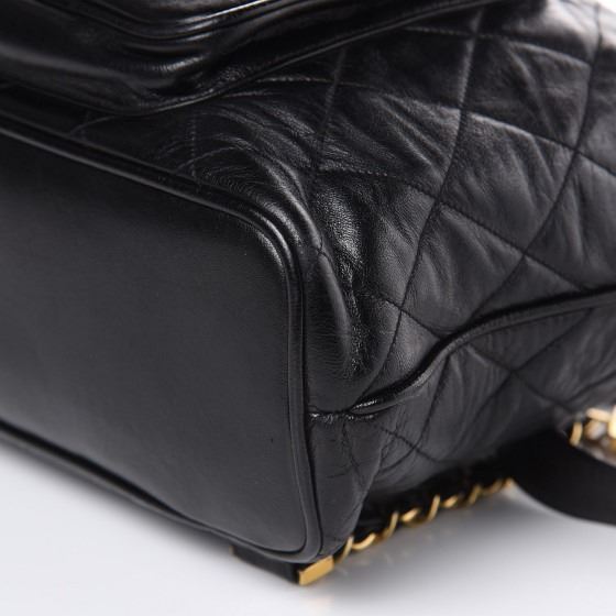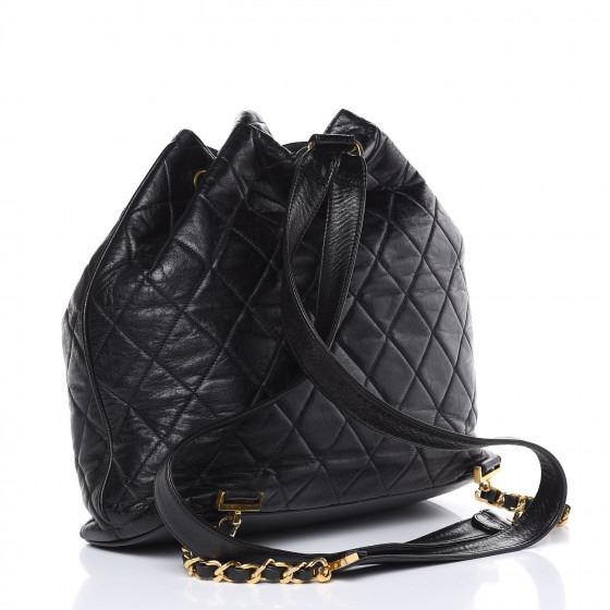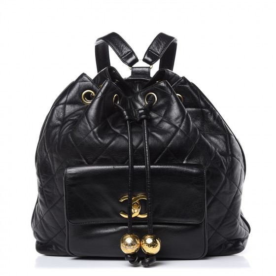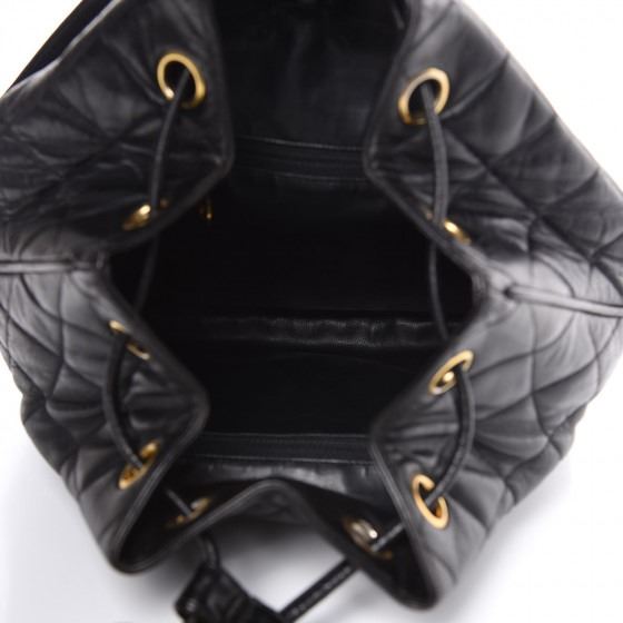 Backpack is crafted of fine quilted lambskin leather in black. The bag features leather threaded gold chain shoulder straps, a frontal pocket and a black leather cinch cord closure. The flap opens to a spacious black leather interior with zipper pockets.