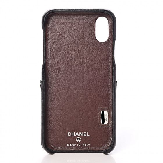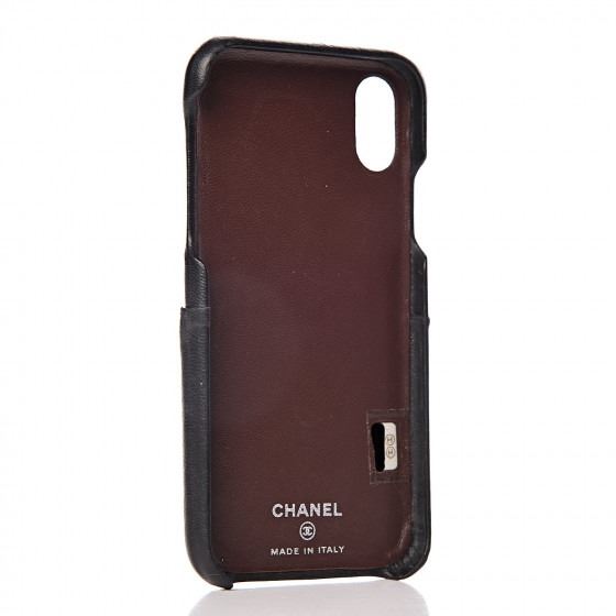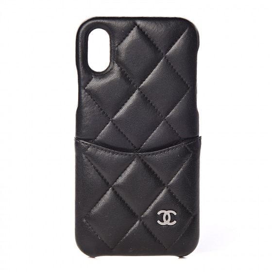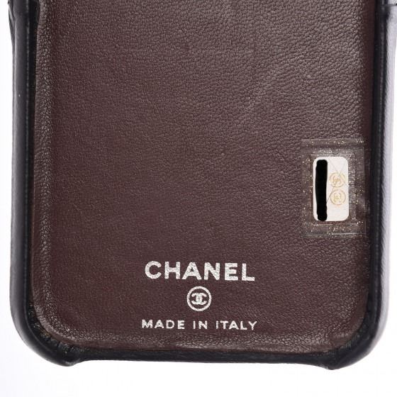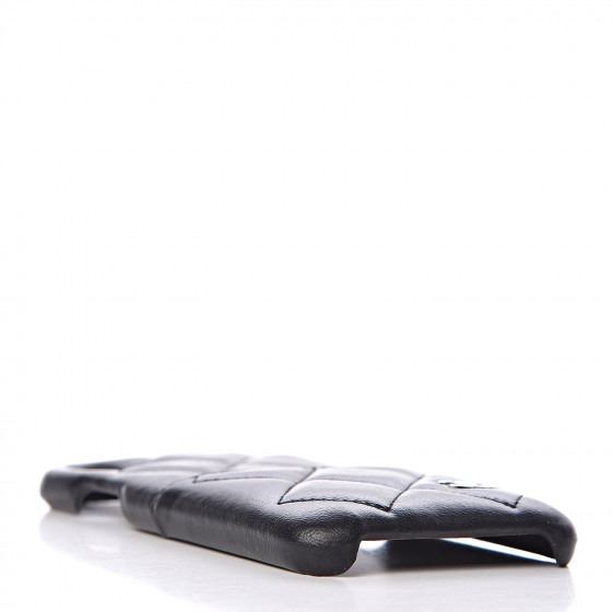 Chic phone case is crafted of padded diamond quilted lambskin leather in black. This case features a polished silver Chanel CC logo, an exterior pocket, with a burgundy leather interior.