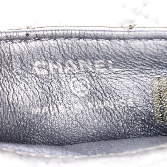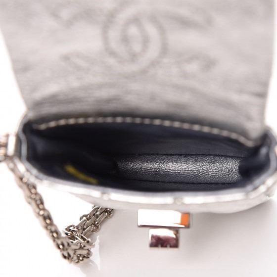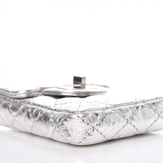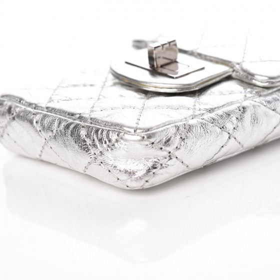 Silver petite crossbody bag is crafted of aged diamond-quilted calfskin leather in metallic silver. The bag features a polished silver reissue chain shoulder strap, and a matching silver mademoiselle turn lock on the crossover flap. This opens the bag to a metallic blue leather interior.