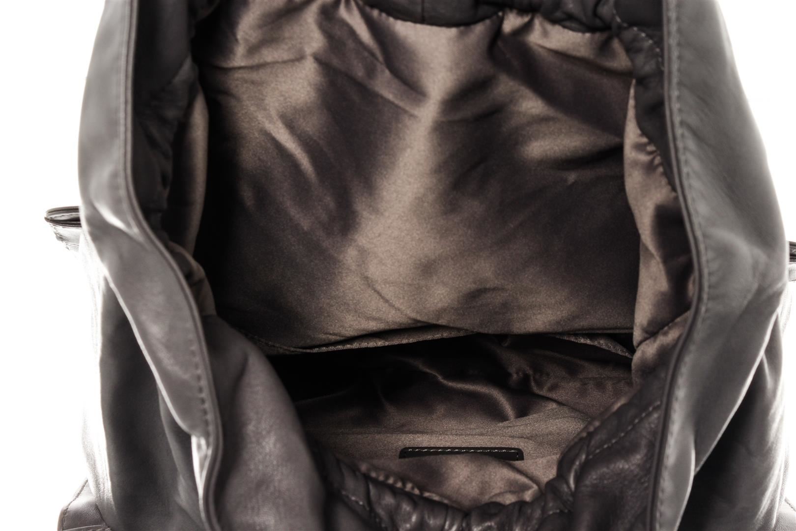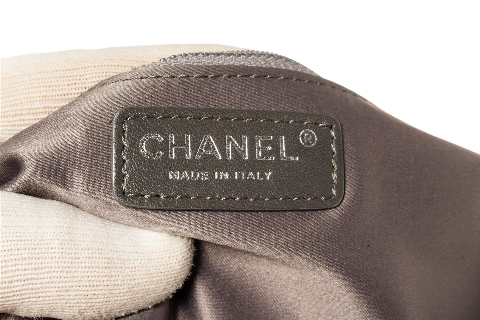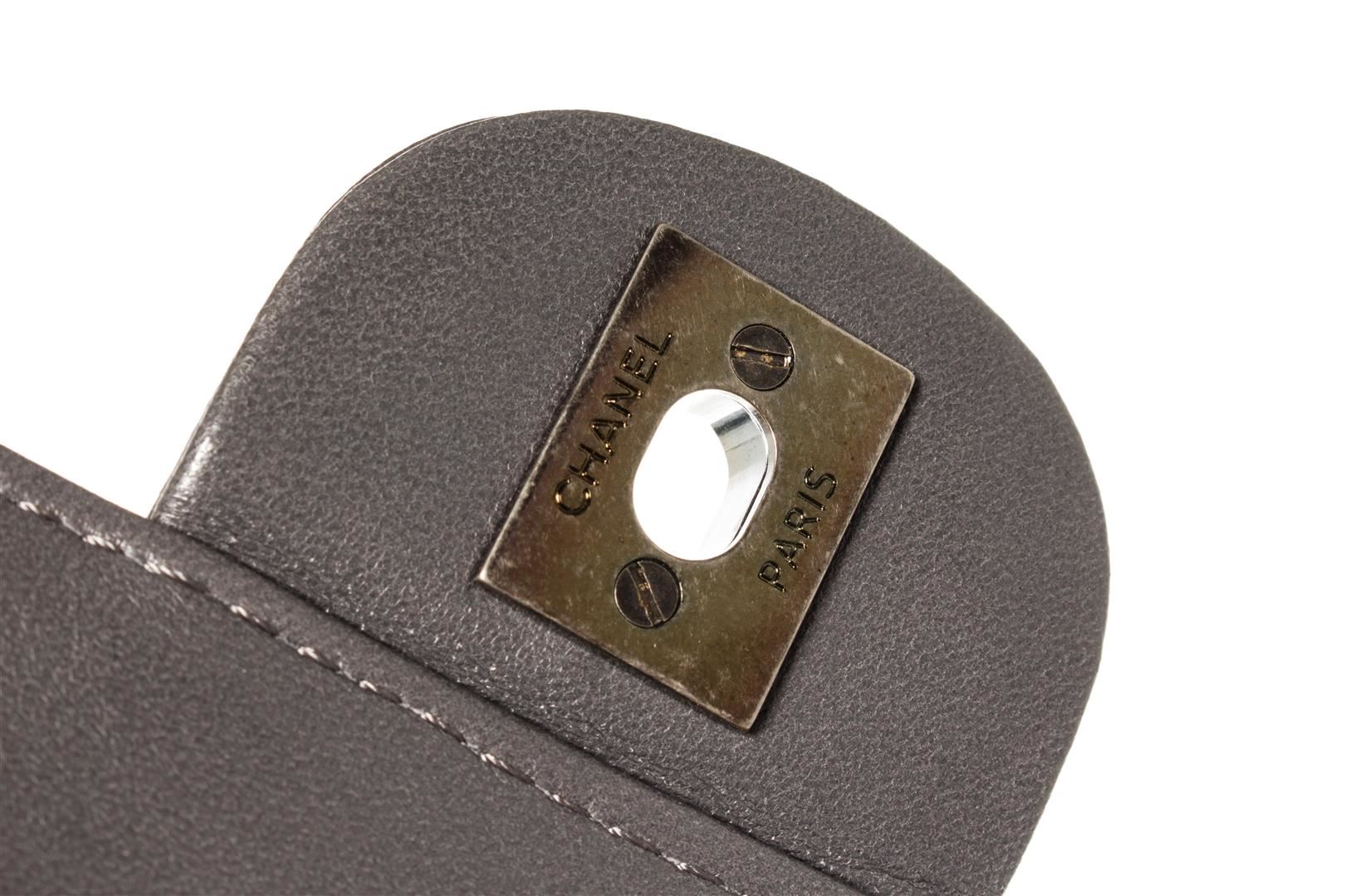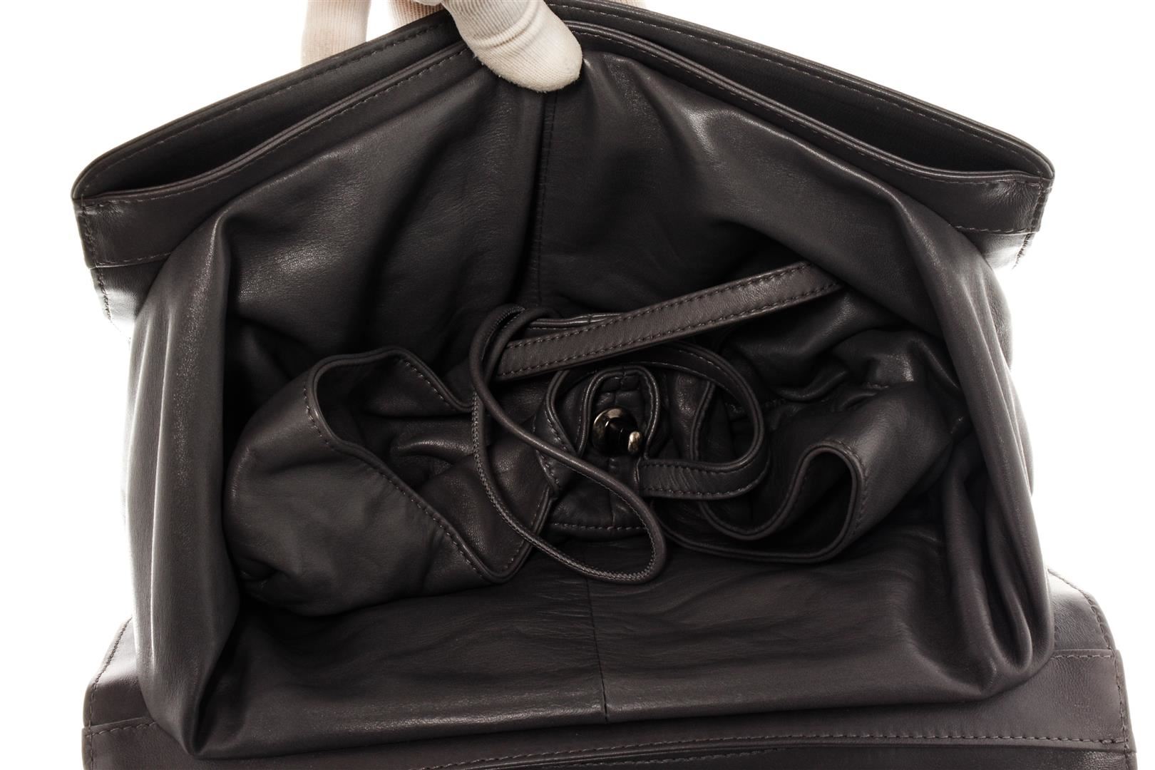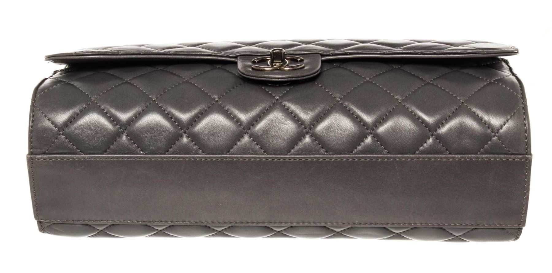 One Chanel Lambskin Quilted 2 Way Chain Drawstring Tote Bag. Item is sold AS-IS. All available information is listed in the description and shown in the photo. Chanel Lambskin Quilted 2 Way Chain Shoulder Bag with silver-tone hardware, gray leather trim, one exterior slip pocket, gray satin lining, drawstring pull out interior pocket, chain strap, and CC turn-lock closure