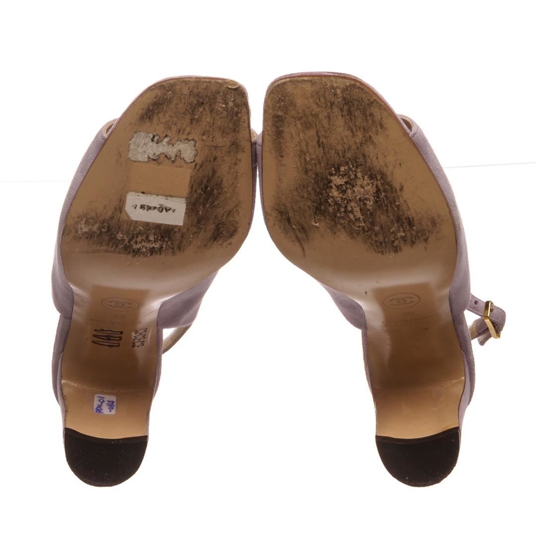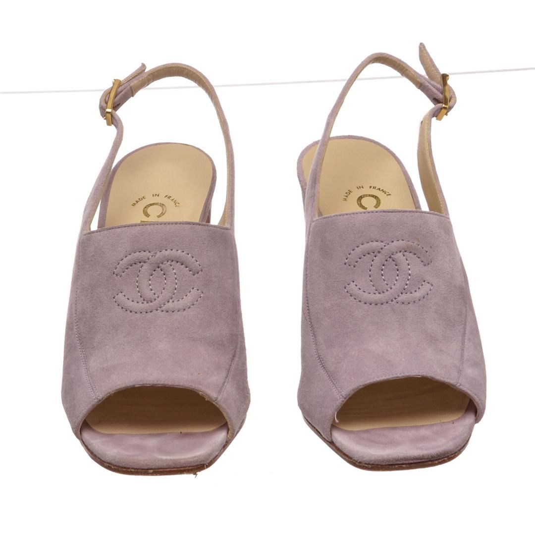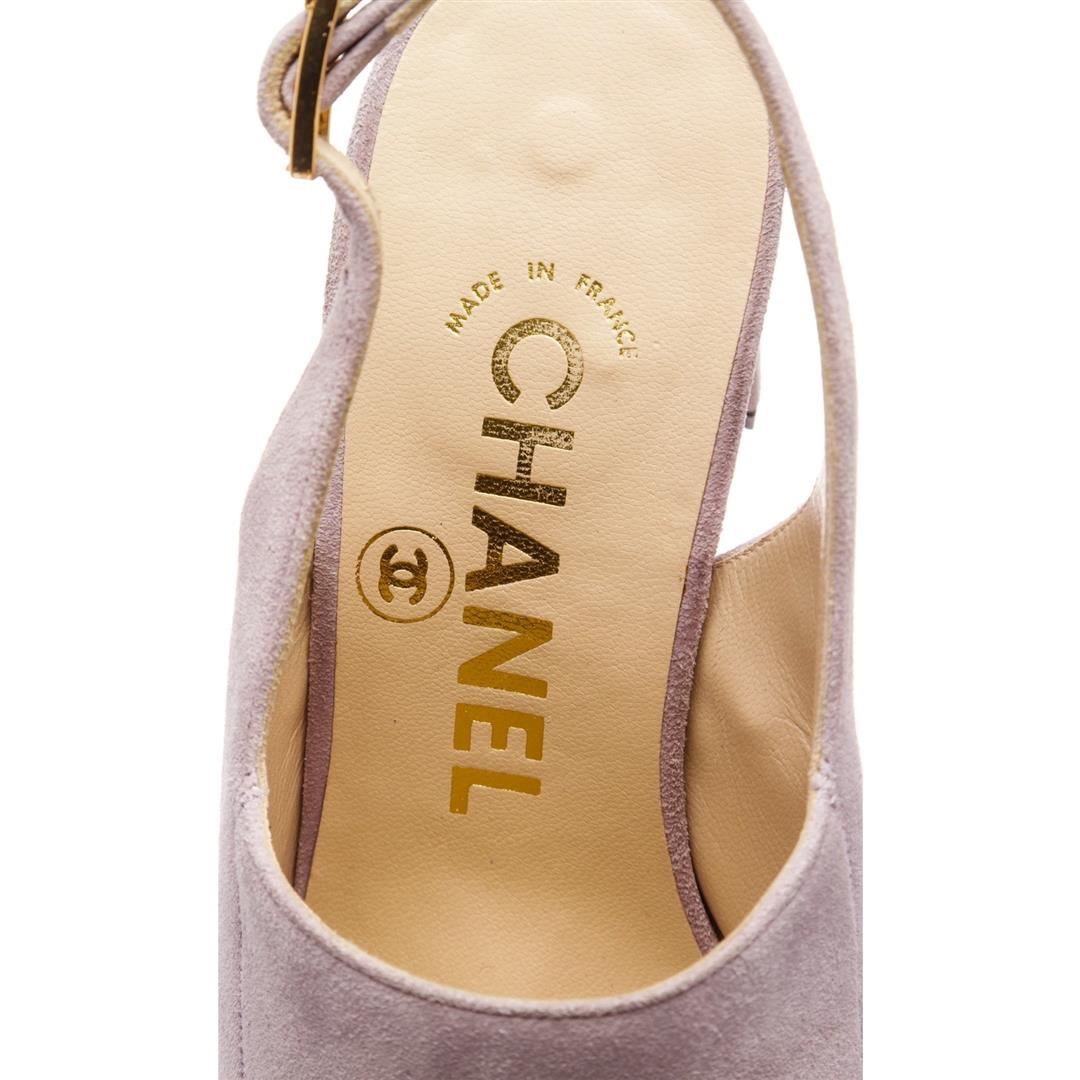 Chanel Lavender Suede CC Open Toe Block Heel Pumps. Designer size 35. Item is pre-owned. Item Dimensions: Insole:7.5"/19.05cm Heel:3"/7.62cm.