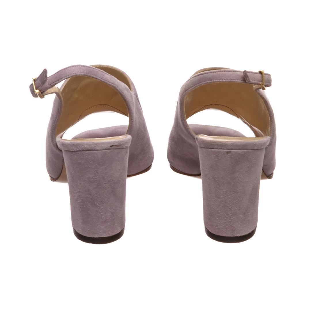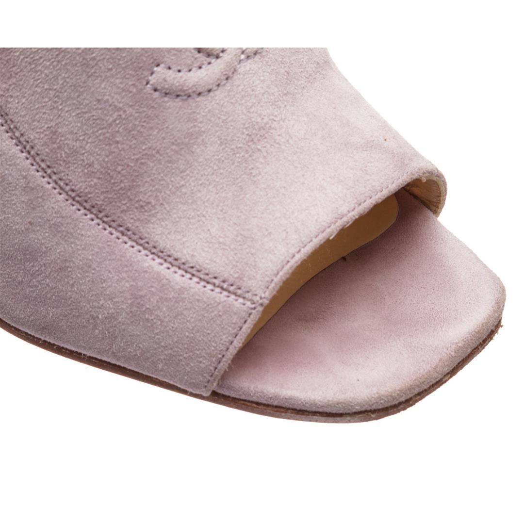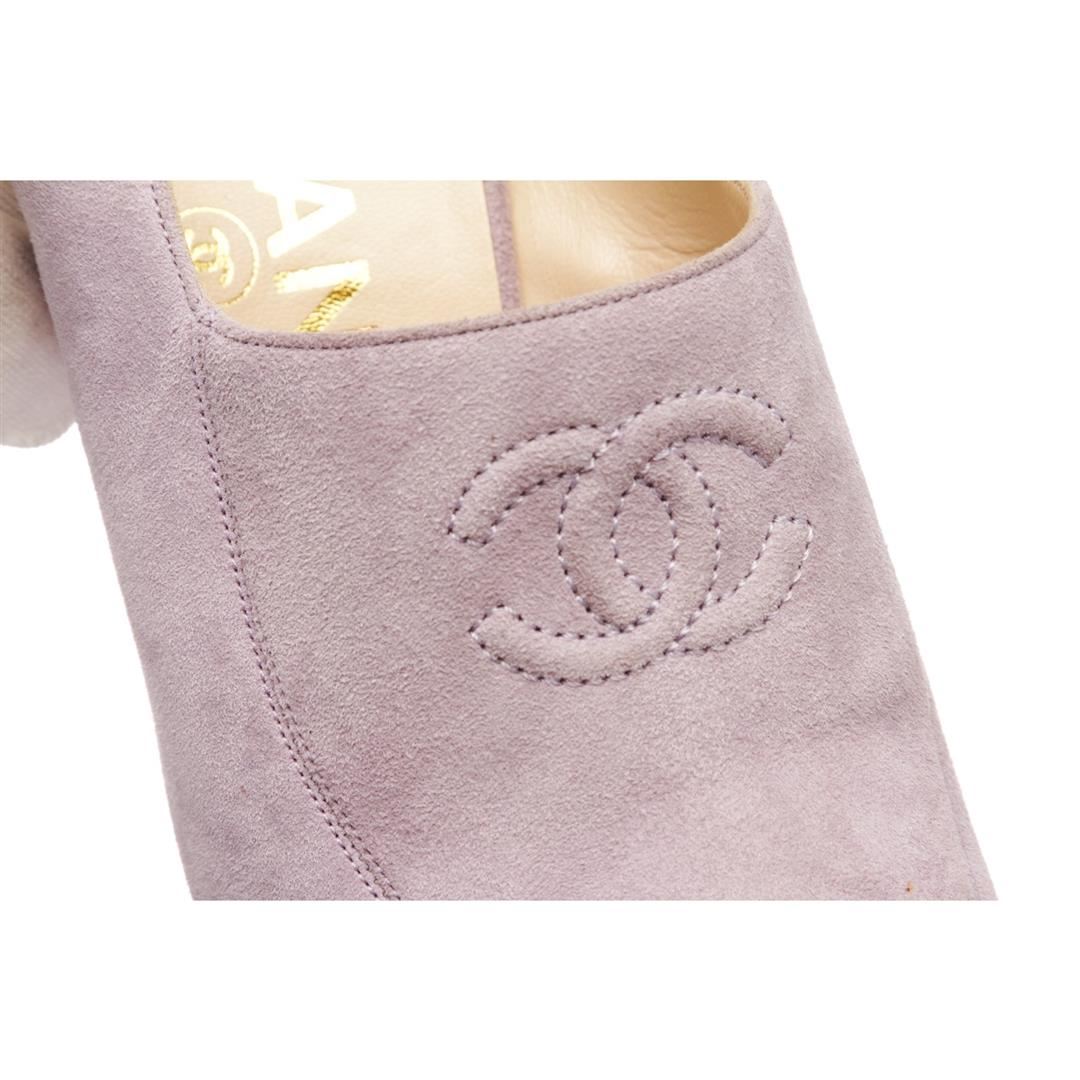 Chanel Lavender Suede CC Open Toe Block Heel Pumps. Designer size 35. Item is pre-owned. Item Dimensions: Insole:7.5"/19.05cm Heel:3"/7.62cm.