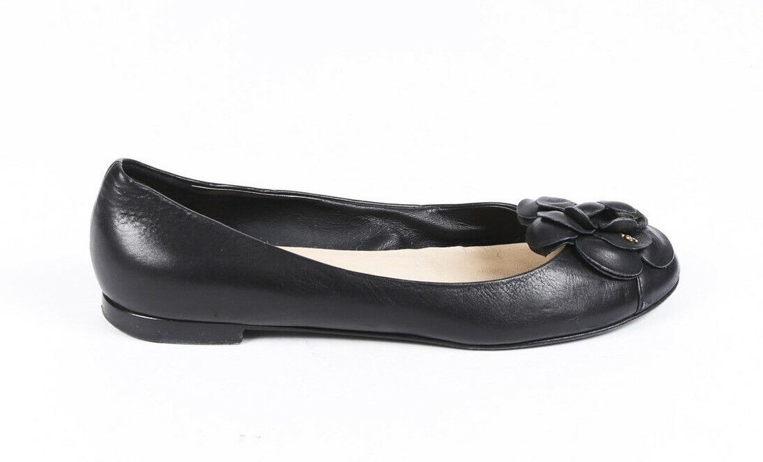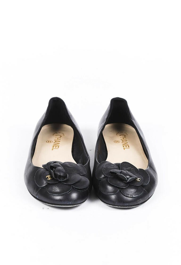 Chanel leather ballet flats feature a round cap toe, Camellia accent with a CC logo emblem, and a flat stacked heel. Style Number: G27312
