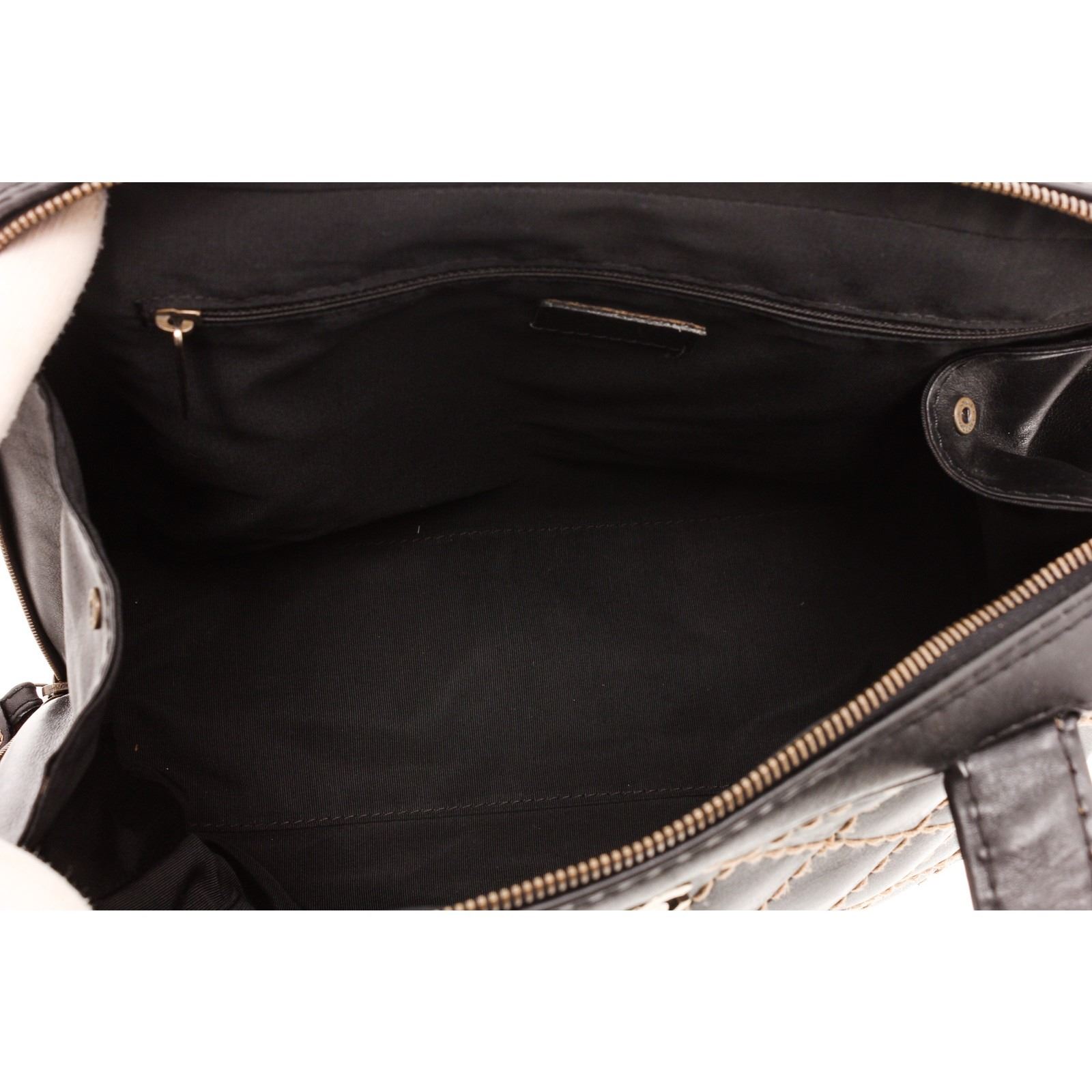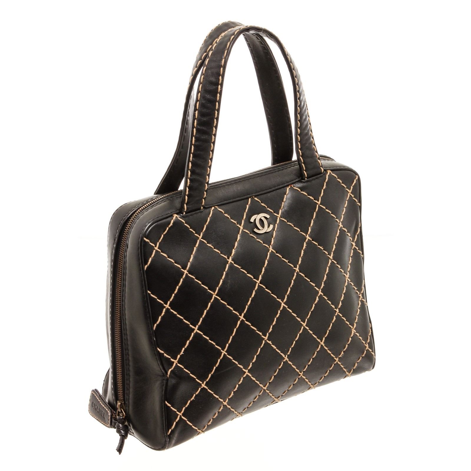 Description: Black quilted leather Chanel Surpique Bowler bag with antiqued silver-tone hardware, dual flat shoulder straps, creme contrast stitching throughout, single slit pocket at back, tonal jacquard lining, three compartments at interior; one with zip closure, dual interior pockets; one with zip closure and zip closure at top.