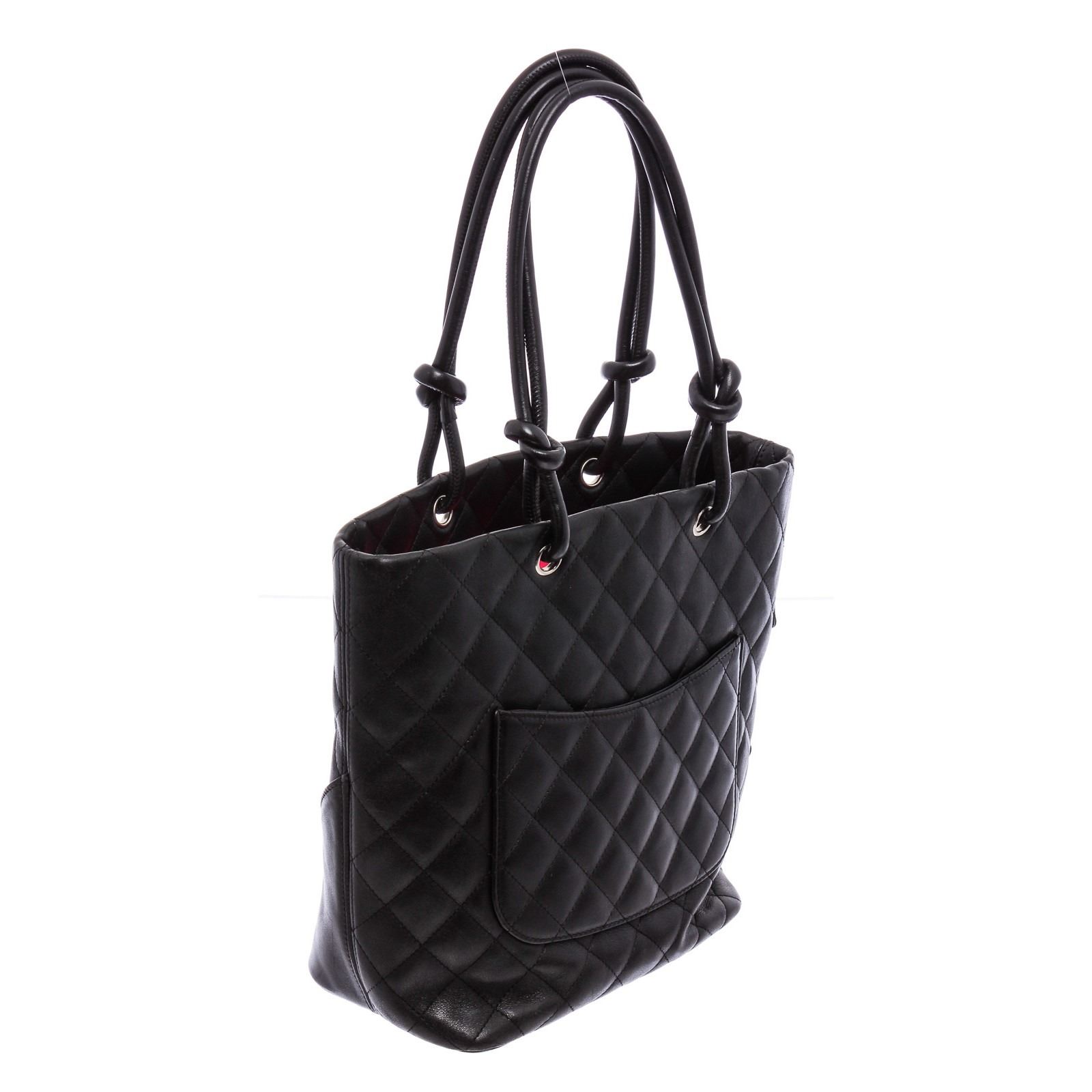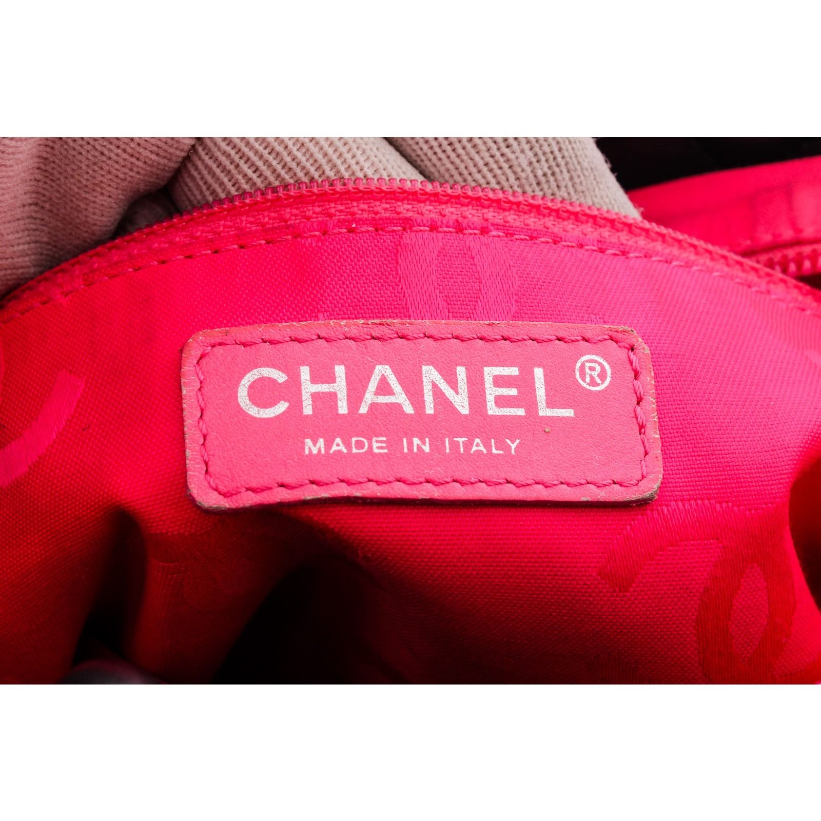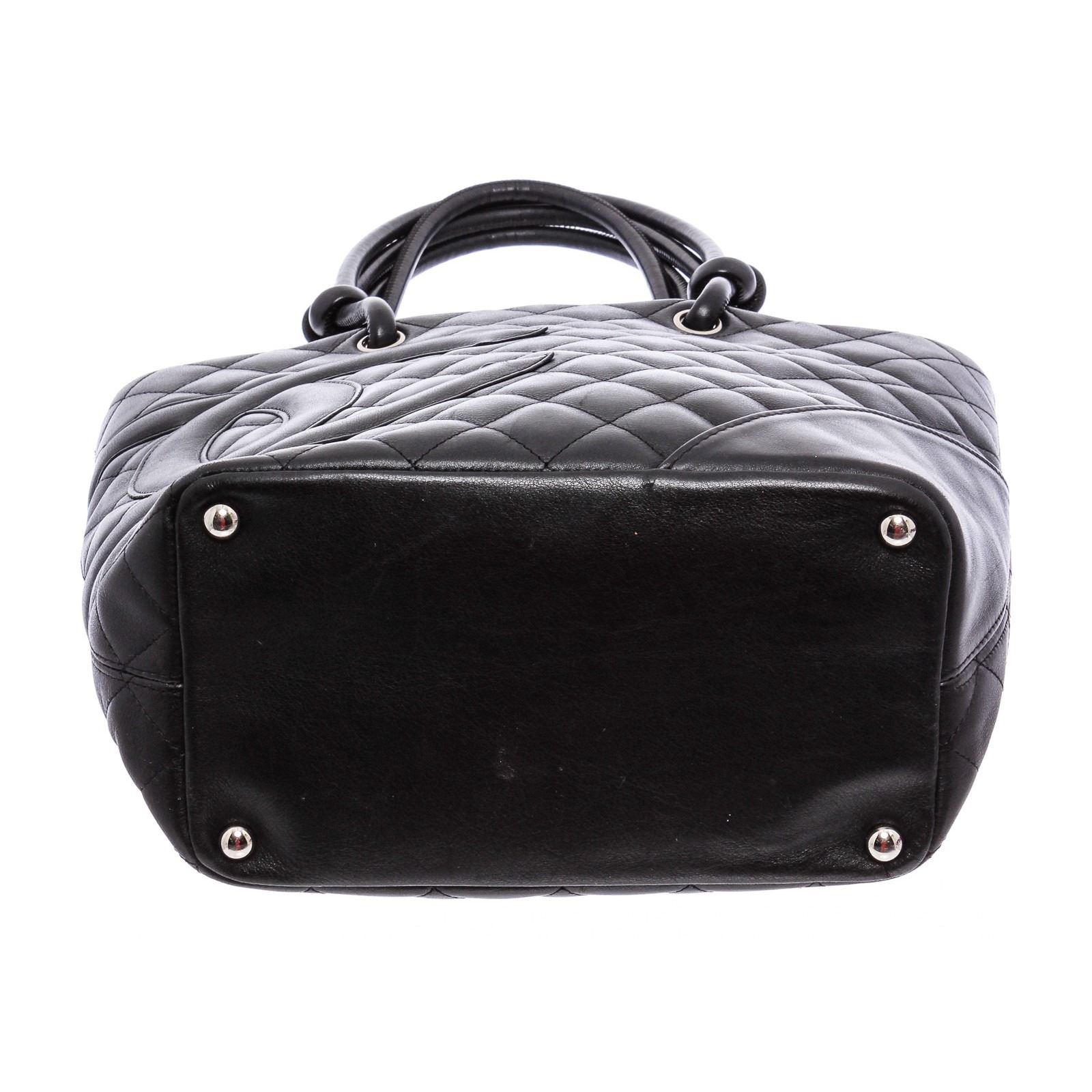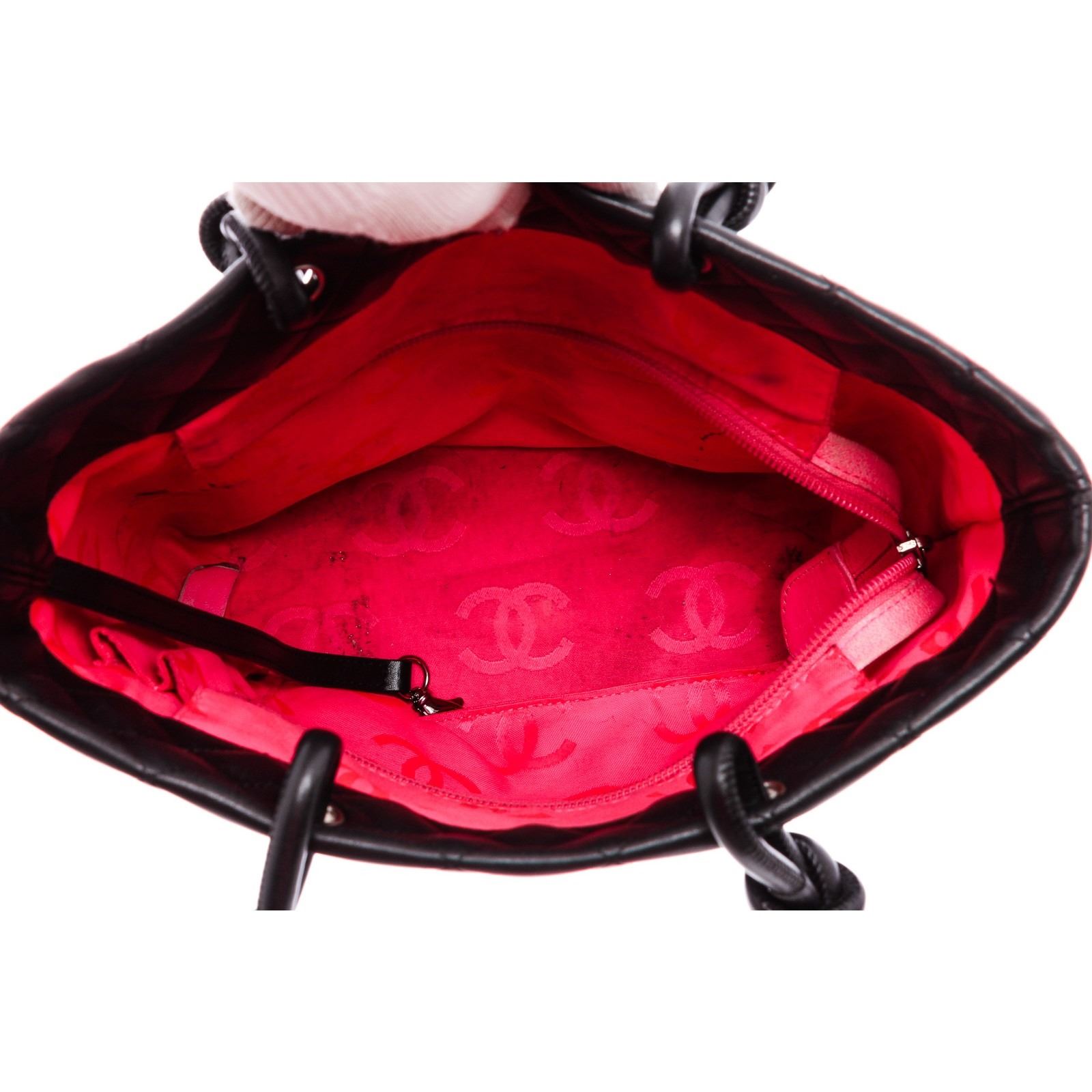 Black quilted lambskin leather Chanel Small Ligne Cambon Bucket tote with silver-tone hardware, dual rolled shoulder straps, CC embossed logo at side, single exterior patch pocket at back, protective feet at base, neon pink logo jacquard lining, dual zip pockets at interior walls, dual pen holsters and zip closure at top.