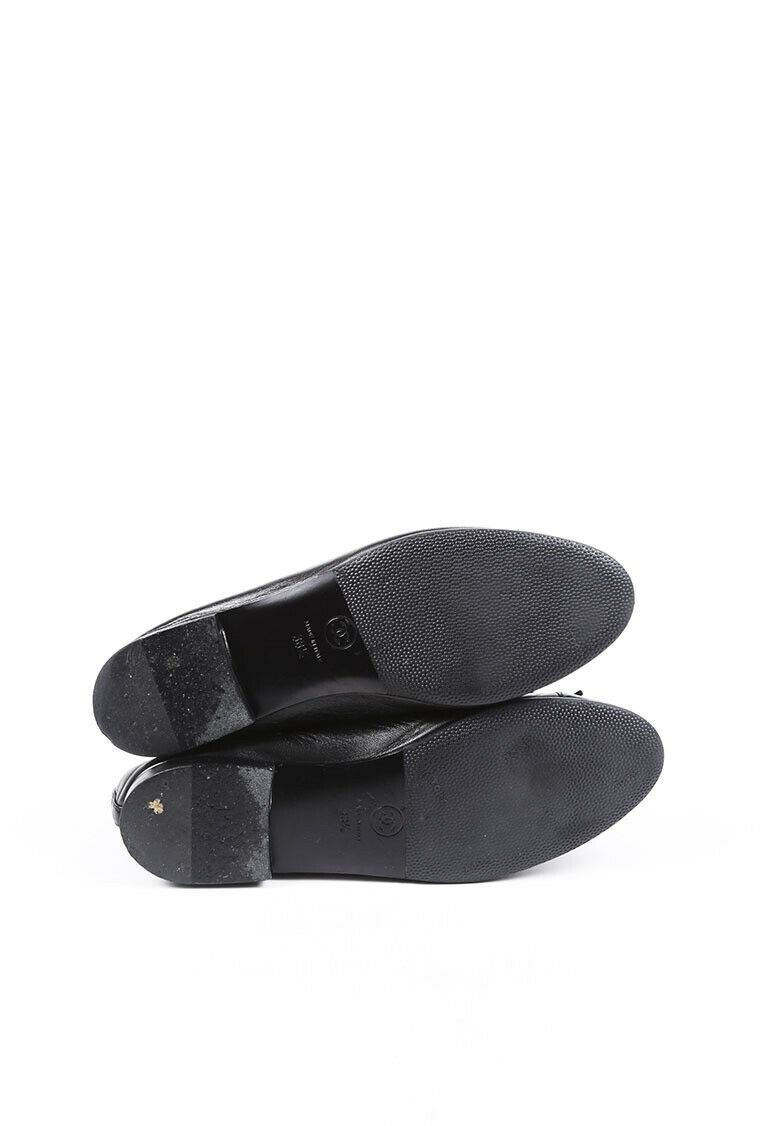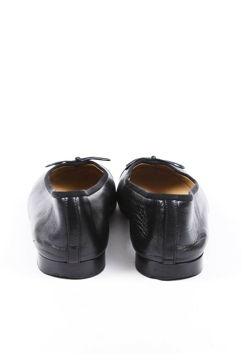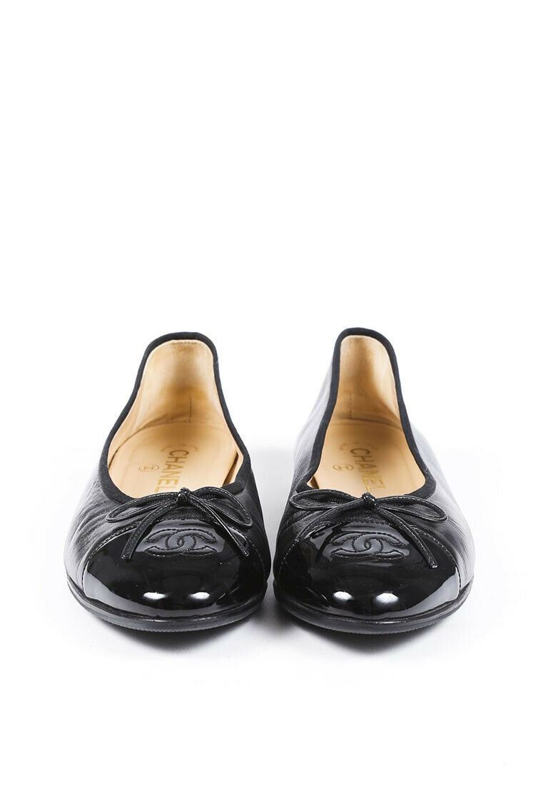 Chanel leather ballet flats feature a patent leather cap toe with the stitched CC logo, tied bow accent, and a flat stacked heel.