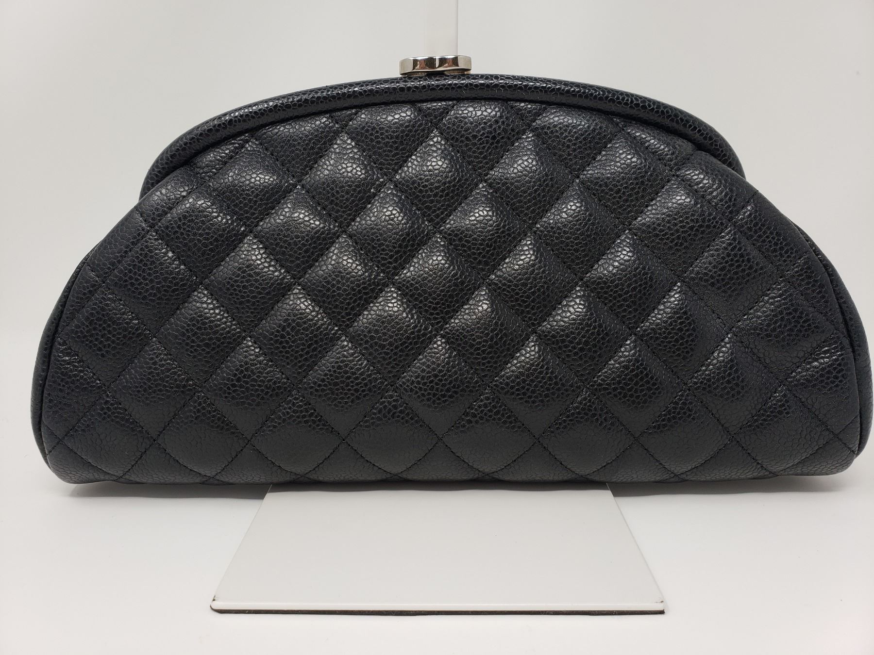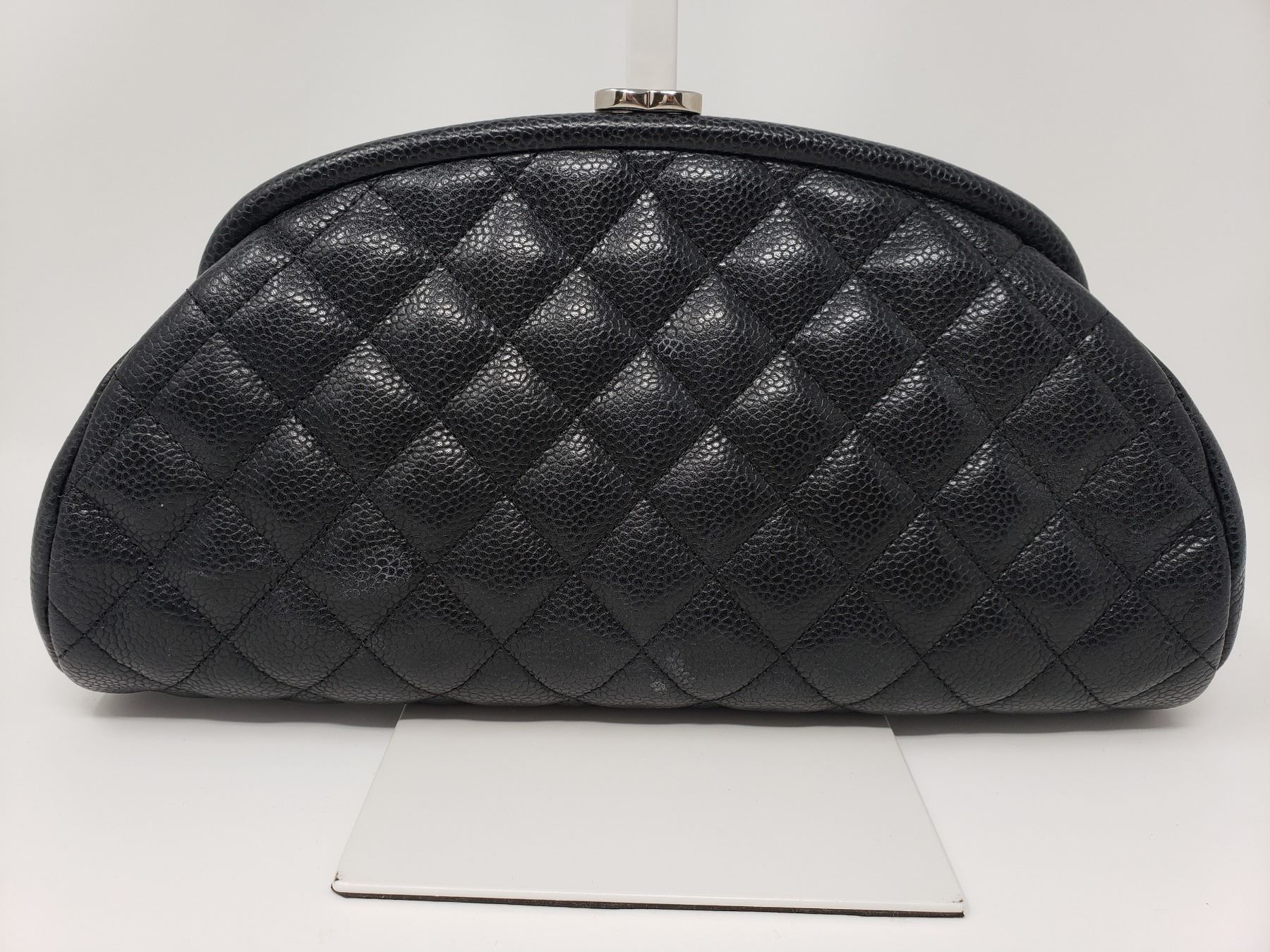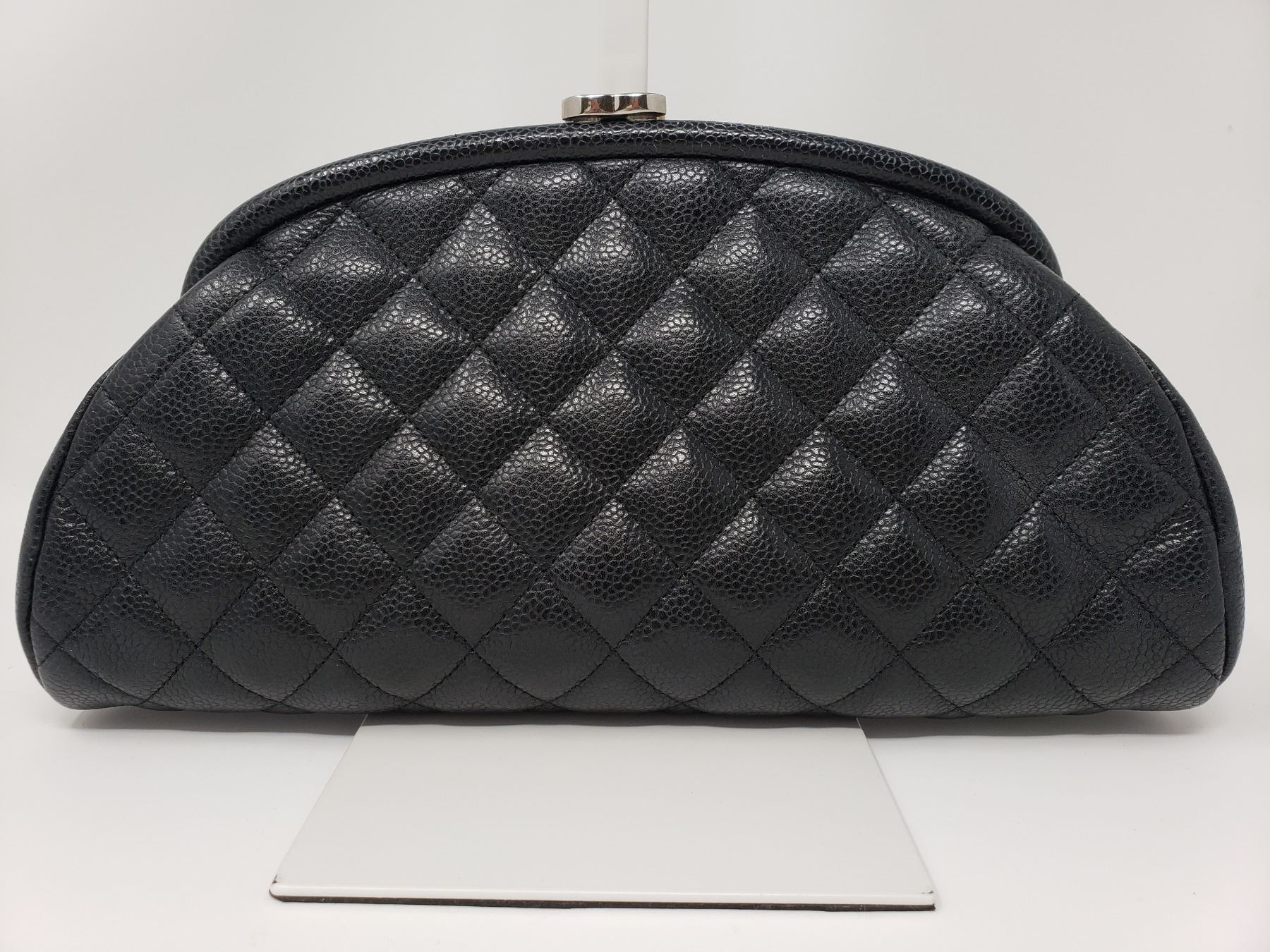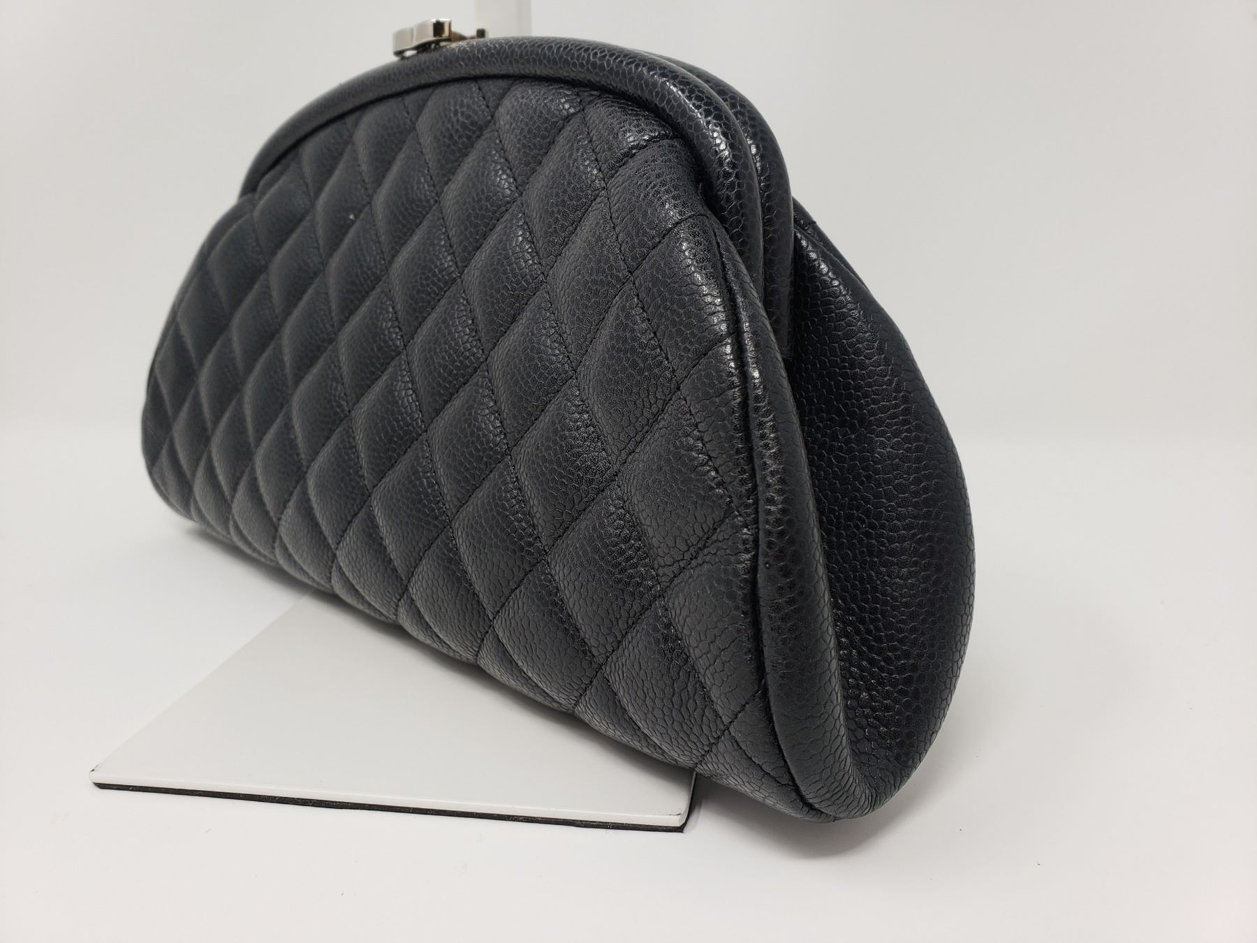 Description: This clutch from the house of Chanel is crafted from Caviar leather and it carries a black quilted exterior. The piece is equipped with a CC kiss lock which reveals a well-sized compartment.