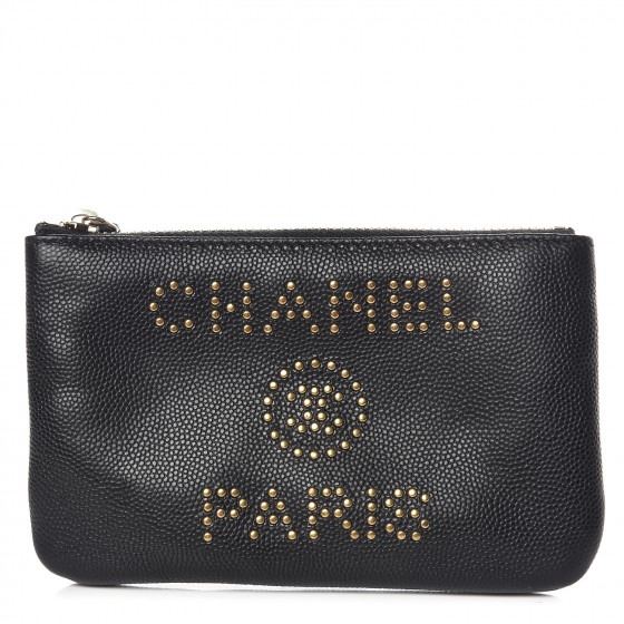 Description: CHANEL Caviar Studded Deauville Cosmetic Pouch Black.This chic cosmetic pouch is crafted of black caviar leather, with a gold studded Chanel logo on the front. The pouch features a matching top zipper that opens to a black fabric interior.