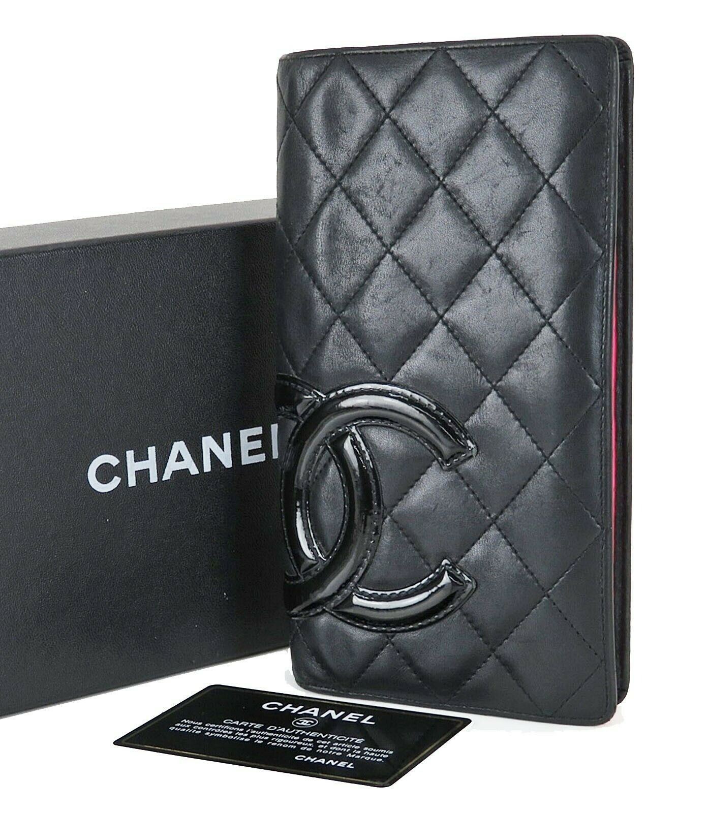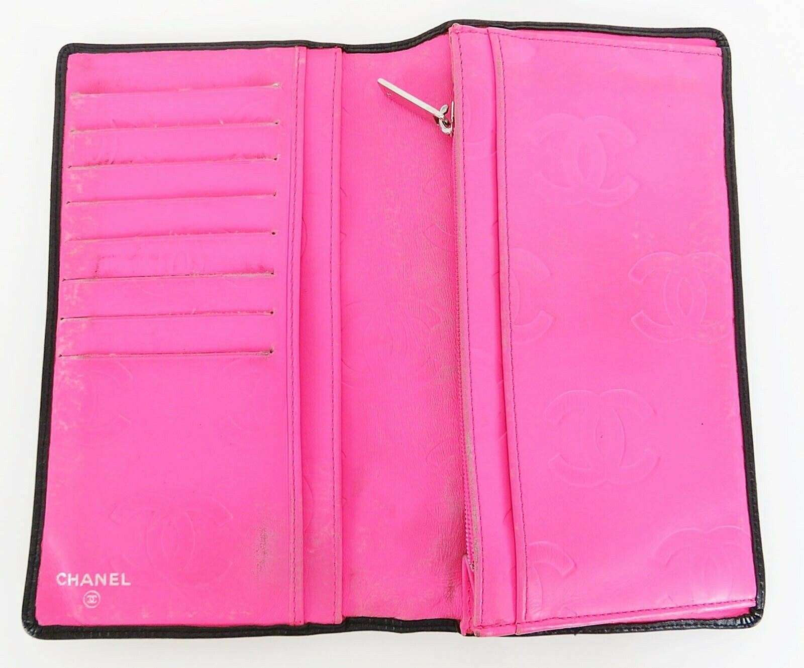 Description: CHANEL Black Quilted Leather CC Long Wallet Coin Purse. Two open pockets and bill slot with zippered coin purse between them. 8 credit card slots with 2 flat pockets behind.