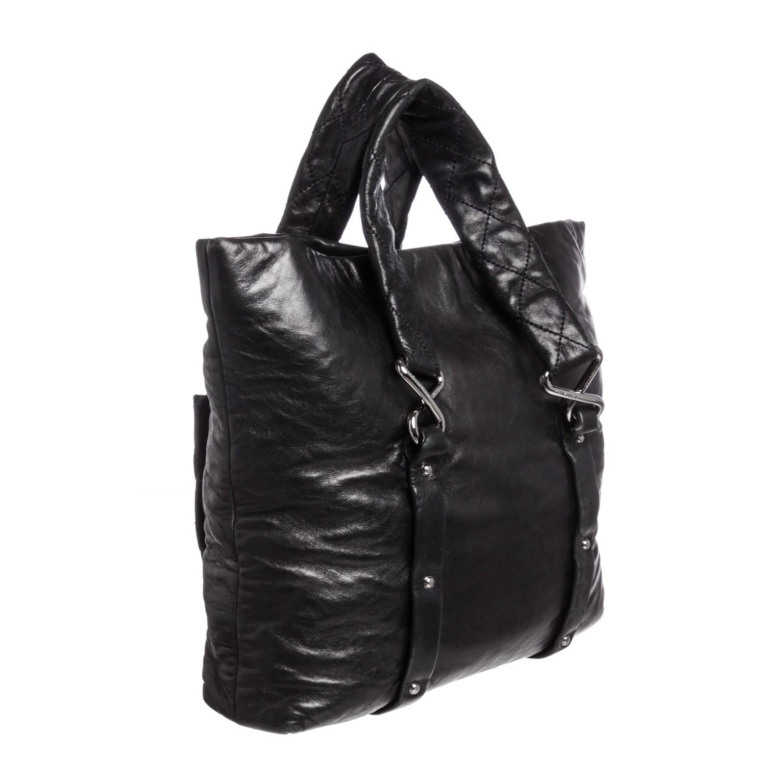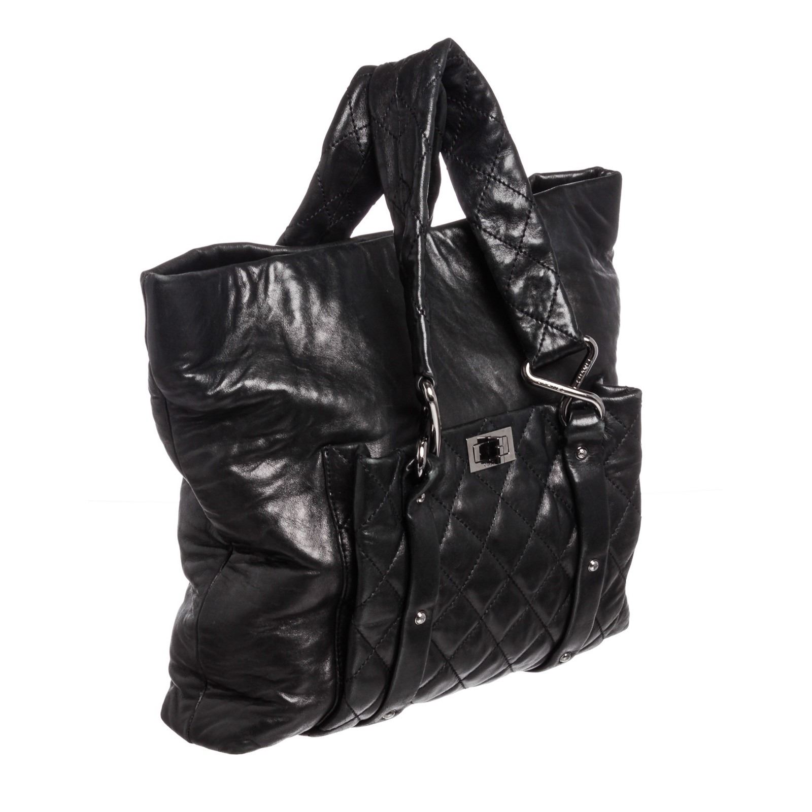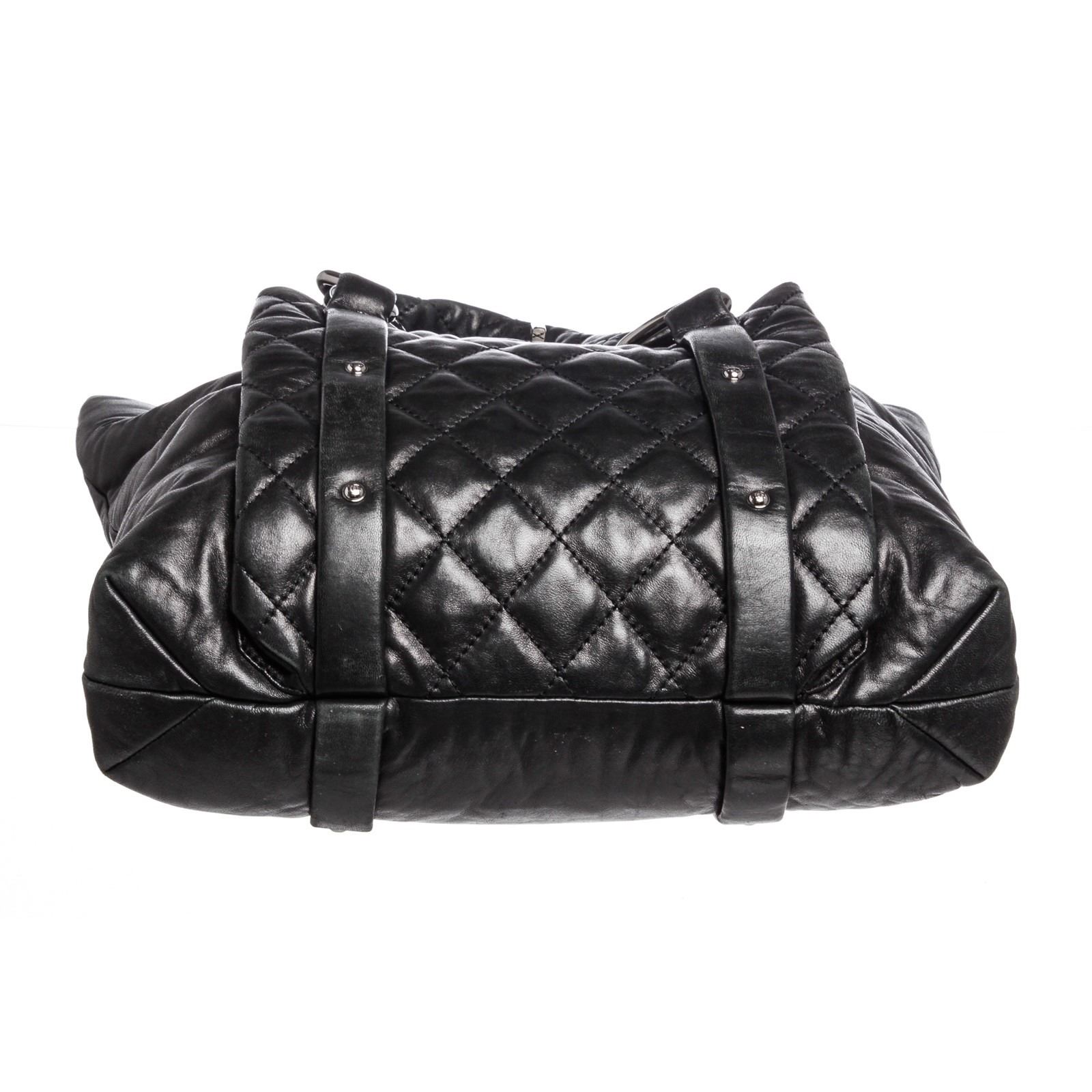 Description: Chanel Black Leather Quilted Reissue Shoulder Bag Tote. Black leather Chanel quilted reissue shoulder bag tote with silver-tone hardware, tonal fabric interior lining, one zipper pocket at interior wall, two side slip pockets and leather key holder clasp. Overall magnetic snap button closure.