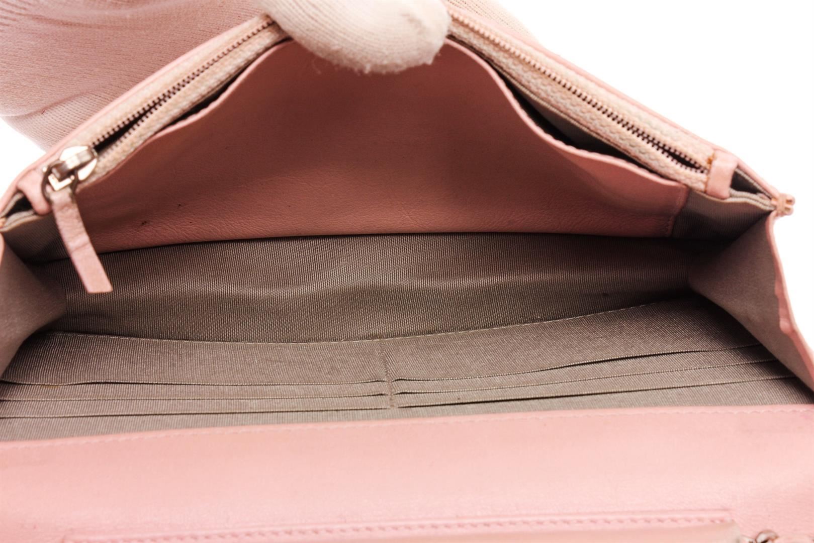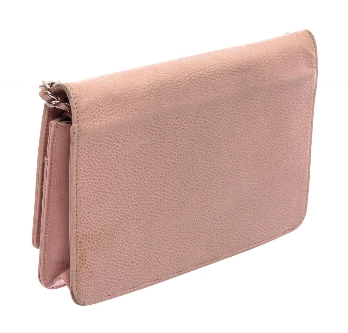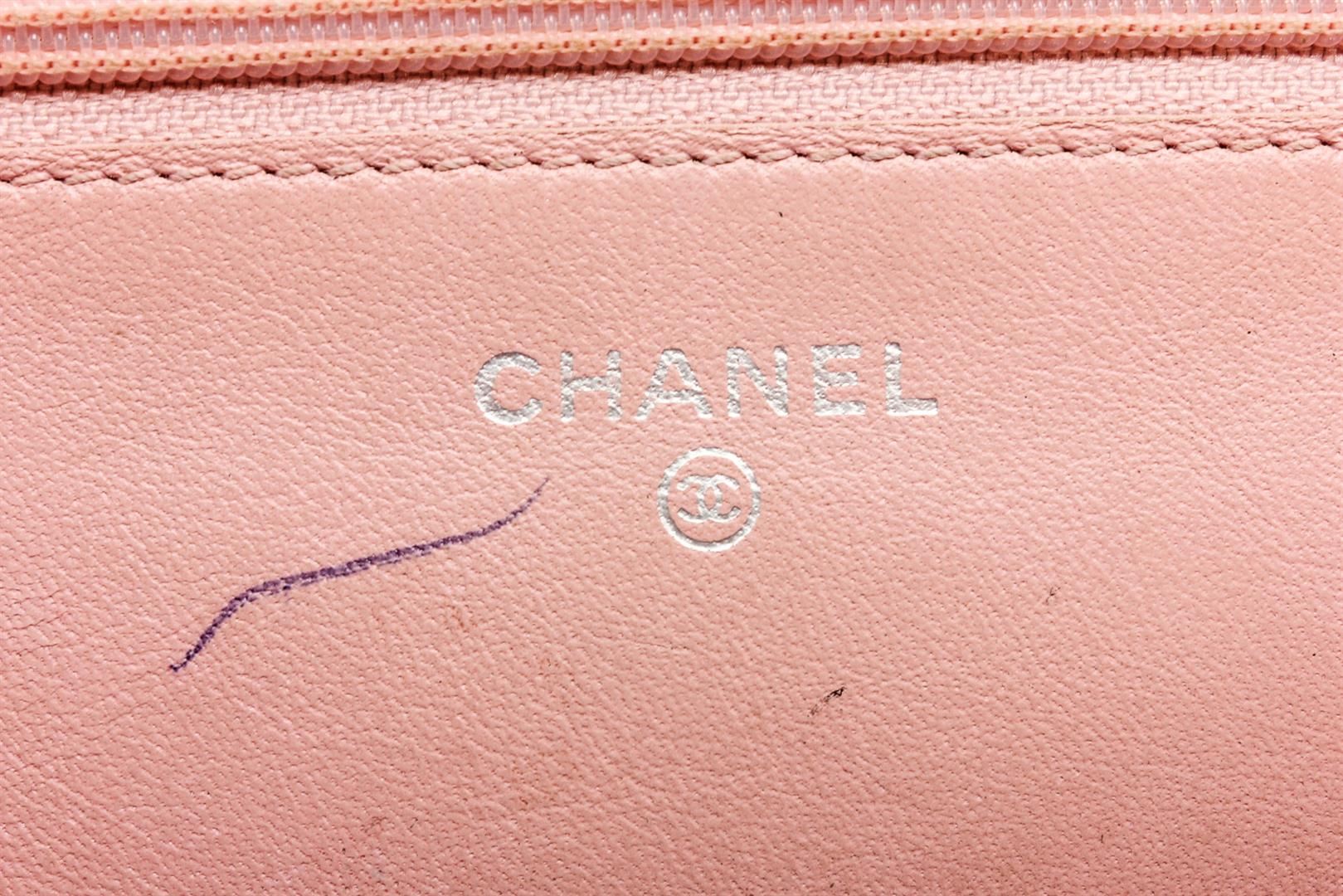 Light Pink Caviar leather Chanel Wallet On Chain with silver-tone hardware, single leather and chain-link shoulder strap, CC logo adornment at front, single zip pocket flap underside, single slit pocket under front flap, dual compartments; one with zip closure, six card slots and snap closure at front flap.