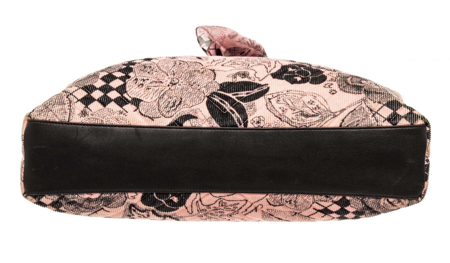 One Chanel Light Pink Printed Corduroy with Silk Scarf Tote Bag. Item is sold AS-IS. All available information is listed in the description and shown in the photo. Chanel Light Pink Printed Corduroy with Silk Scarf Tote Bag with gold-tone hardware, black leather trims, black canvas lining, dual leather flat top handles, and zip closure at the top. .