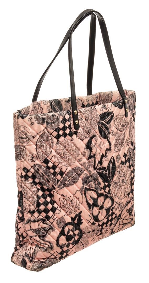 One Chanel Light Pink Printed Corduroy with Silk Scarf Tote Bag. Item is sold AS-IS. All available information is listed in the description and shown in the photo. Chanel Light Pink Printed Corduroy with Silk Scarf Tote Bag with gold-tone hardware, black leather trims, black canvas lining, dual leather flat top handles, and zip closure at the top. .