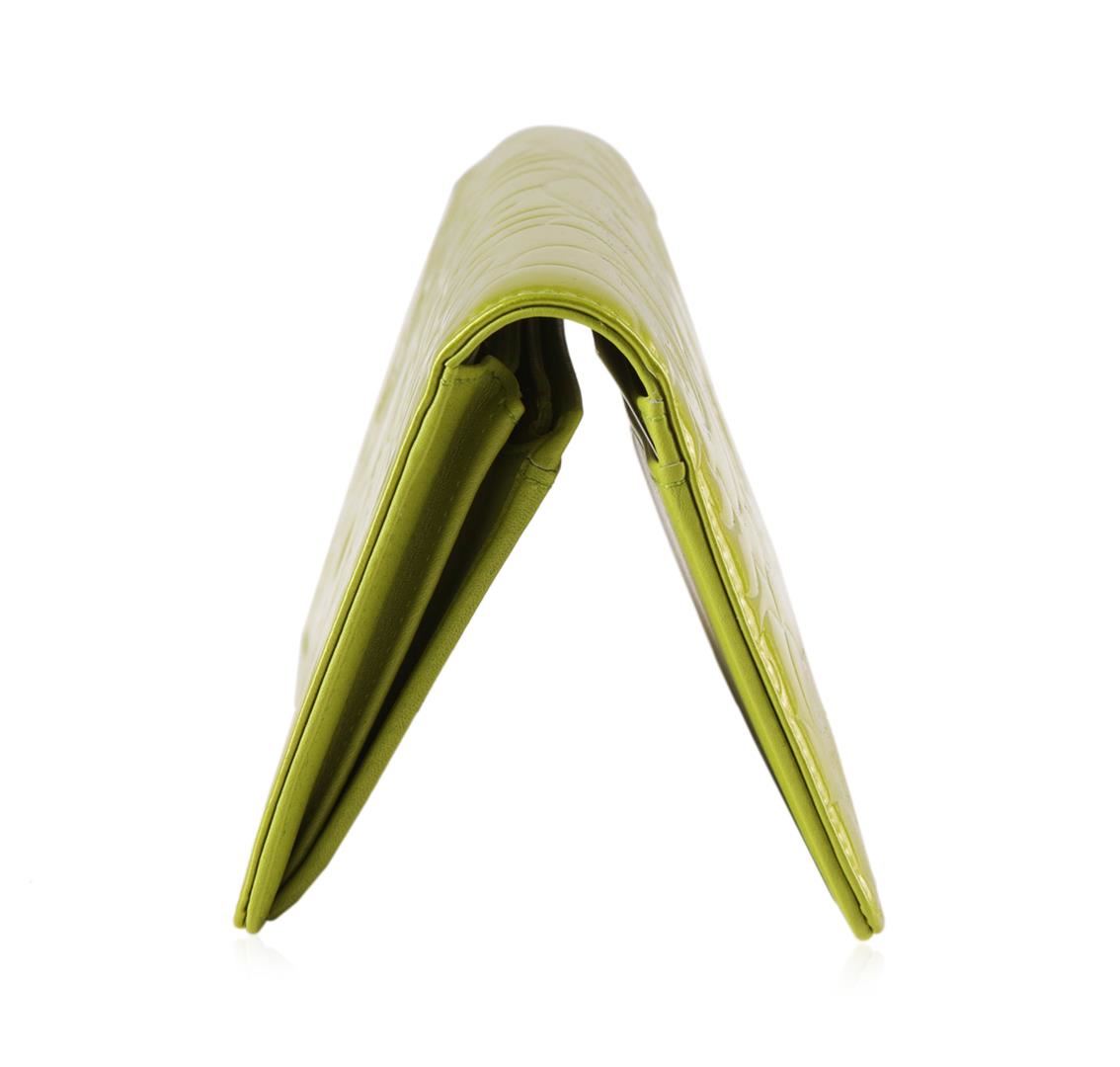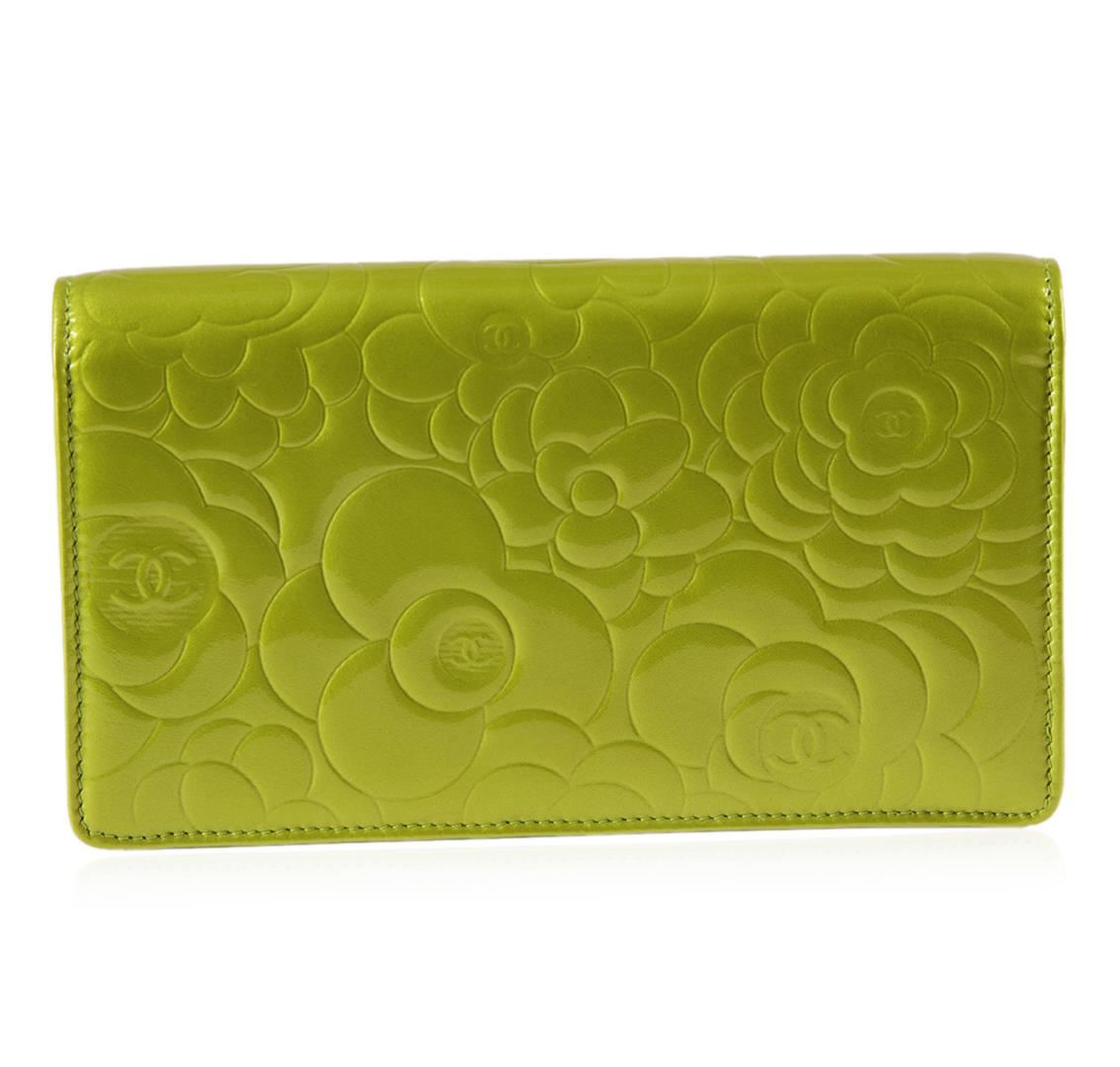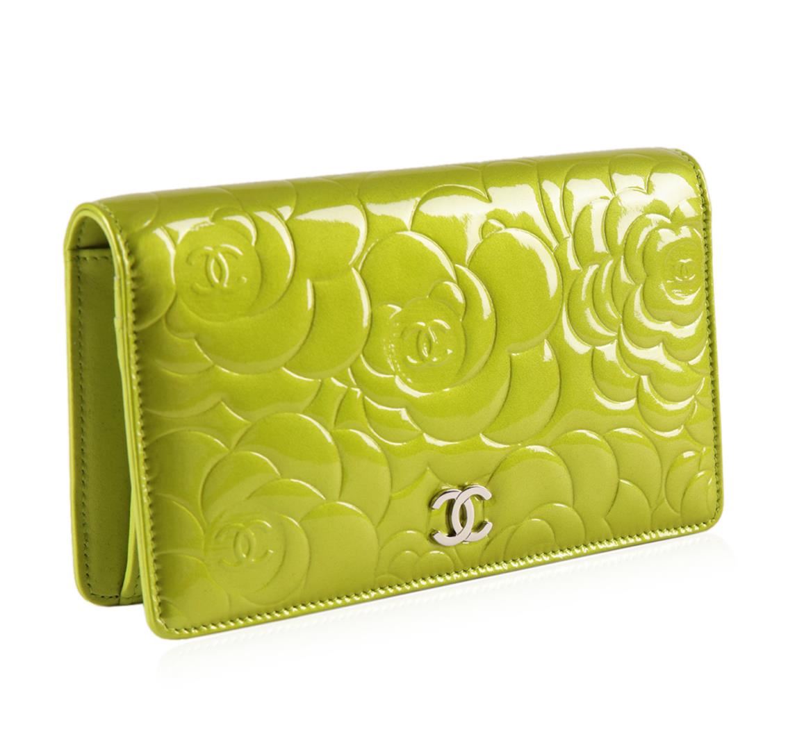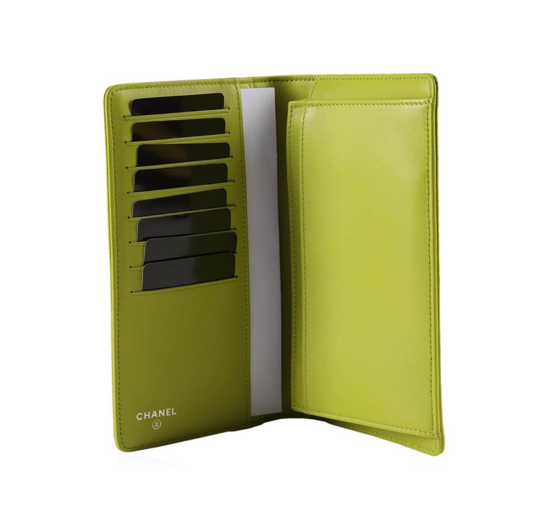 One Chanel lime green patent leather wallet measuring approximately 7.25 by 4.25 inches. The wallet is in good condition with multiple slots for credit cards, bills, and a zipper coin purse for change. Comes with a Chanel box.