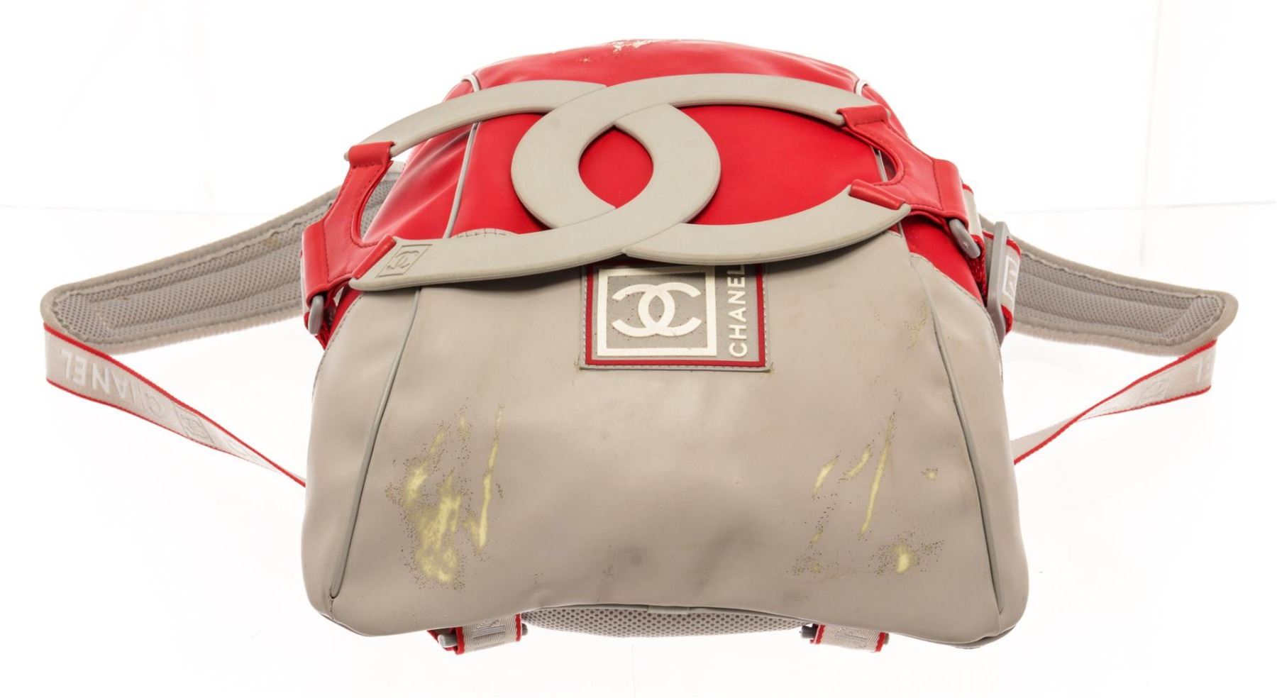 Chanel Line Backpack Red and Gray Vinyl. Brand: Chanel, Style: Line, Type: Backpack, Exterior Color: Red and Gray, Exterior Material: Vinyl, Exterior Pockets: None, Interior Color: Gray, Interior Material: Nylon, Interior Pockets: One, Closure: Zip Around, Handle/Strap Type: Dual Flat Handles, Length: 1N/A, Width: 2, Height: 15, Strap Drop: 12. Condition: Poor, heavy vinyl chipping. Item is sold AS-IS and all information pertaining to this lot is available in the photos or this description.