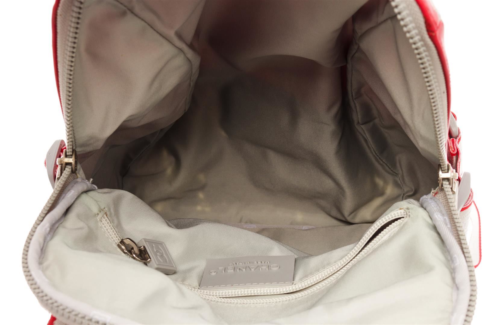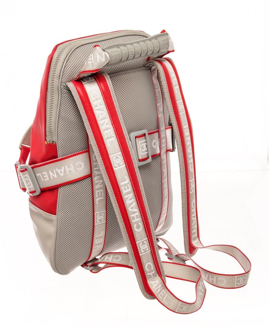 Chanel Line Bag Backpack. Brand: Chanel, Style: Line Bag, Type: Backpack, Exterior color: Red and Gray, Exterior material: Vinyl, Interior color: Gray, Interior material: Nylon, Length: 10, Width: 2, Height: 15. Item is sold AS-IS and all information pert