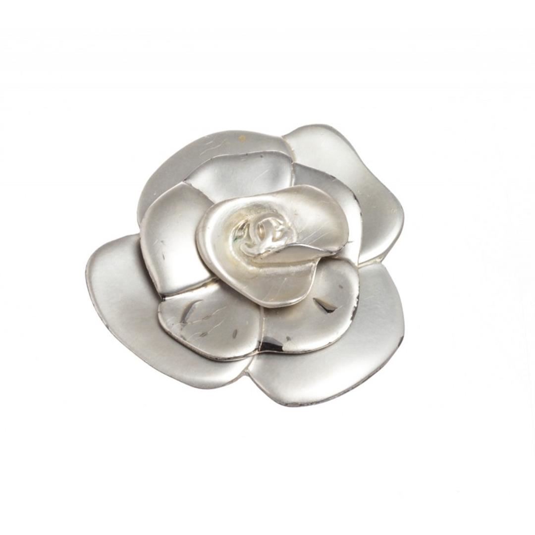 Chanel Matte Silver Camellia Flower Brooch with an overall pin backing closure. From the 2001 Fall Collection. Item is pre-owned. Item Dimensions: 2"x2"/5cmx5cm.