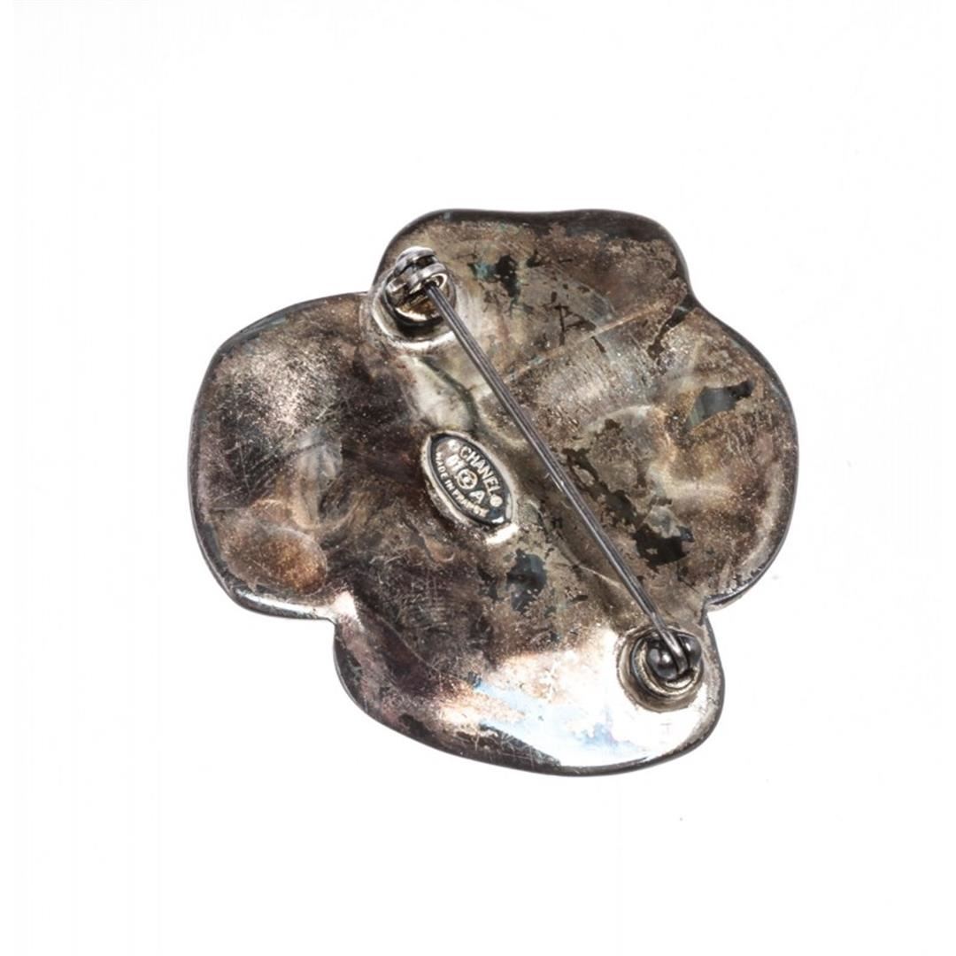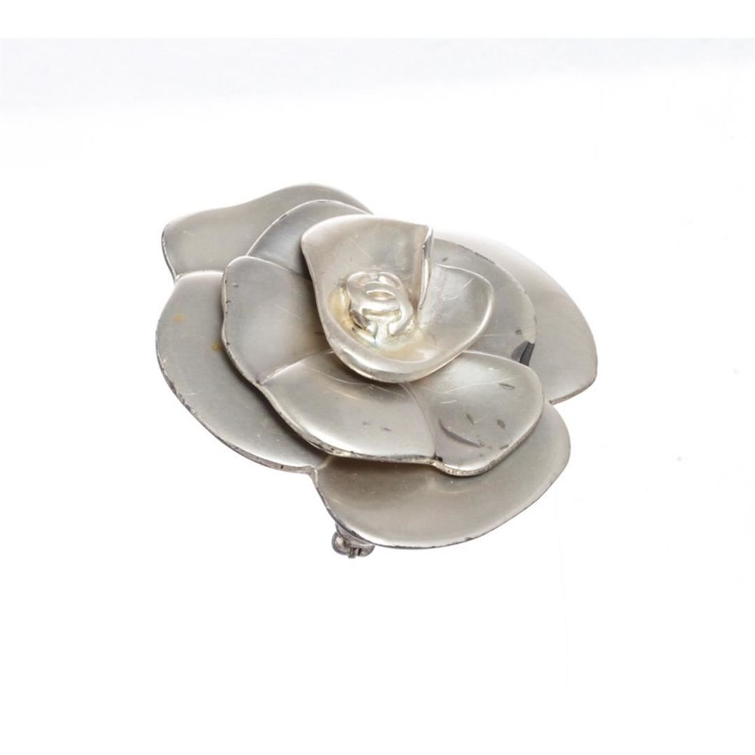 Chanel Matte Silver Camellia Flower Brooch with an overall pin backing closure. From the 2001 Fall Collection. Item is pre-owned. Item Dimensions: 2"x2"/5cmx5cm.