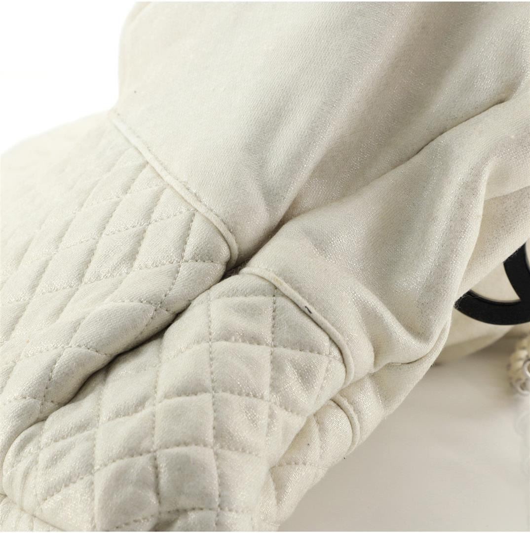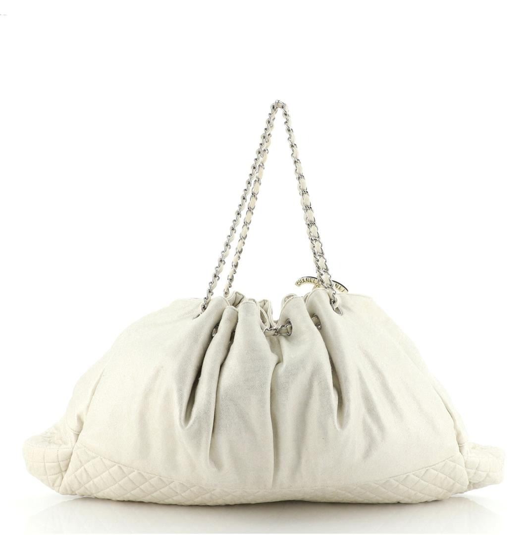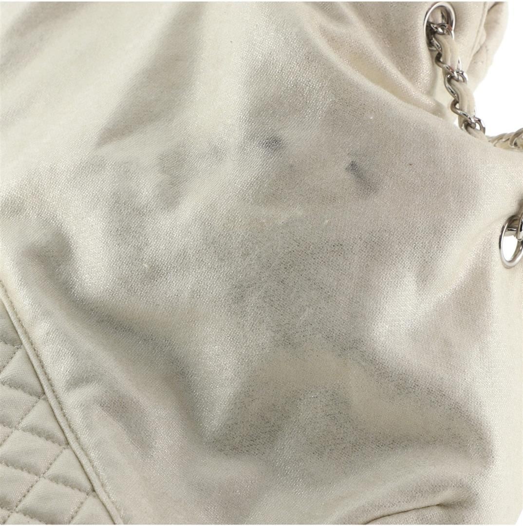 One Chanel Melrose Cabas Tote Jersey Large Neutral. Item is sold AS-IS. All available information is listed in the description and shown in the photo. Chanel Melrose Cabas Tote Jersey Large Beige Jersey Condition Details: Moderate discoloration and stains on exterior and handles, scratches on hardware. Height 13", Width 25", Depth 2.5", Strap Drop None