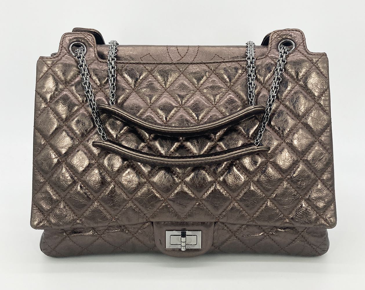 Chanel Metallic Bronze Quilted Leather Classic Flap Shopping Tote in excellent condition. Metallic bronze quilted glazed calfskin exterior trimmed with gunmetal hardware. Classic flap front pocket with mademoiselle twist closure. Back slit pocket. Main center compartment with top snap flap closure opens to a matching bronze leather interior with 2 separate storage sides. Back side holds one side zipped pocket while the front has 1 slit and 1 cell phone pocket. Overall excellent condition. No stains smells or scuffs. clean corners edges and interior. purchase includes a dust cover and manufacturers booklet. measurements: 13.5"x11x7.5" 12.5-22.5" strap drop #Bags3023