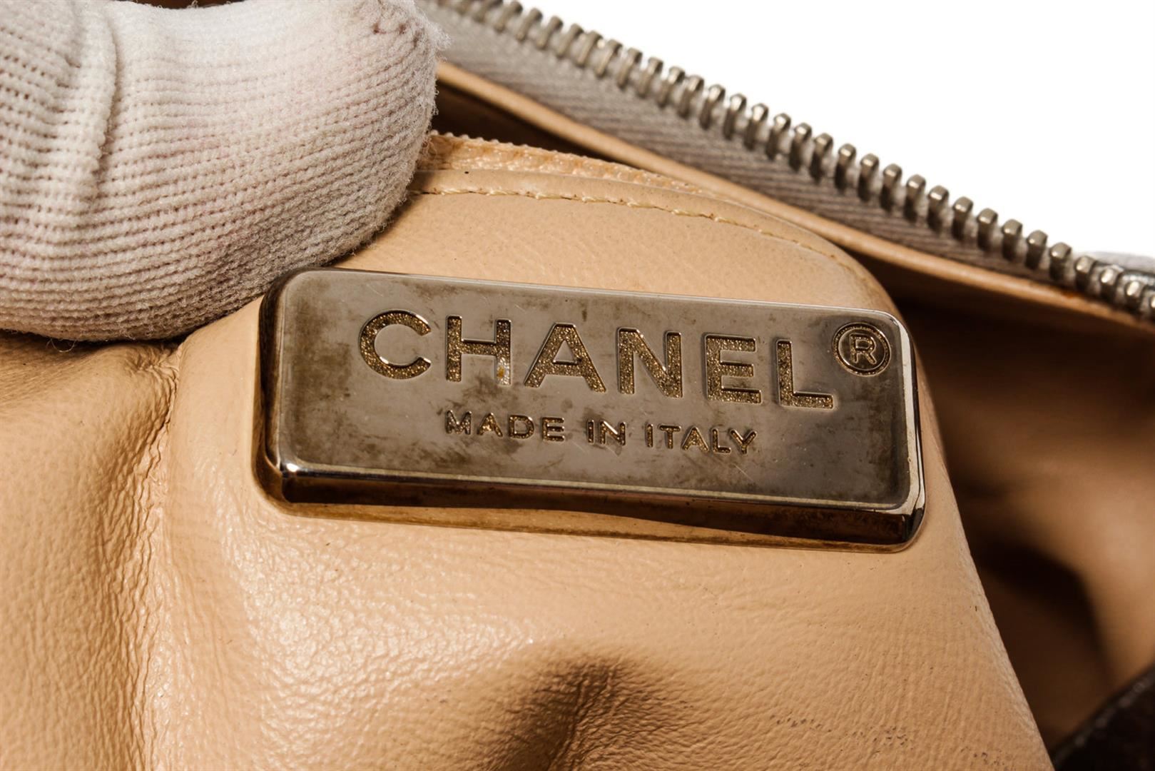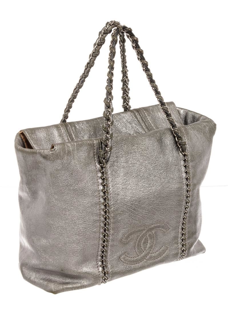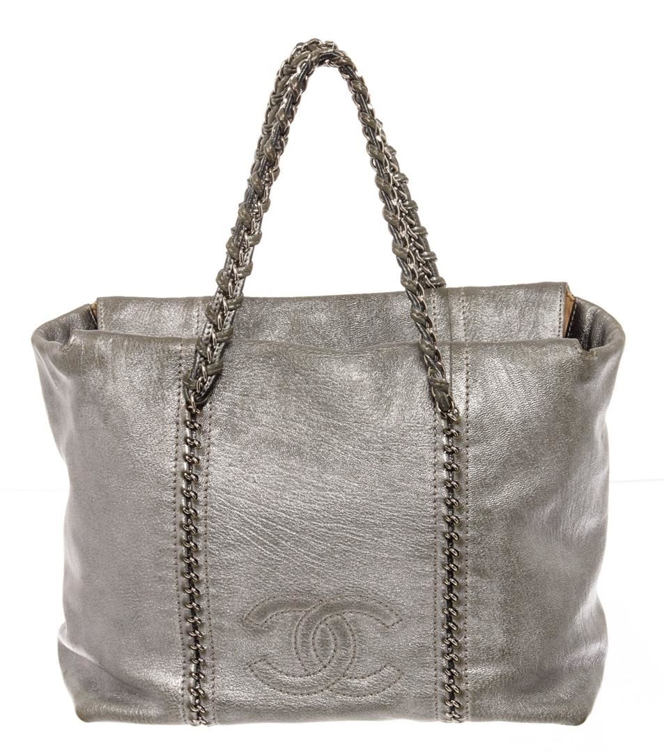 Chanel Metallic Silver CC Chain Tote Bag with leather, gold-tone hardware, trim leather, interior slip pockets, chain shoulder strap and zipper closure.