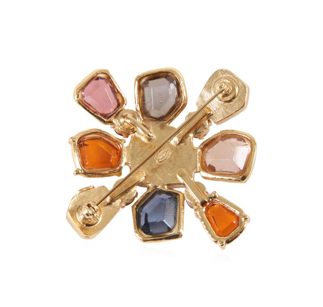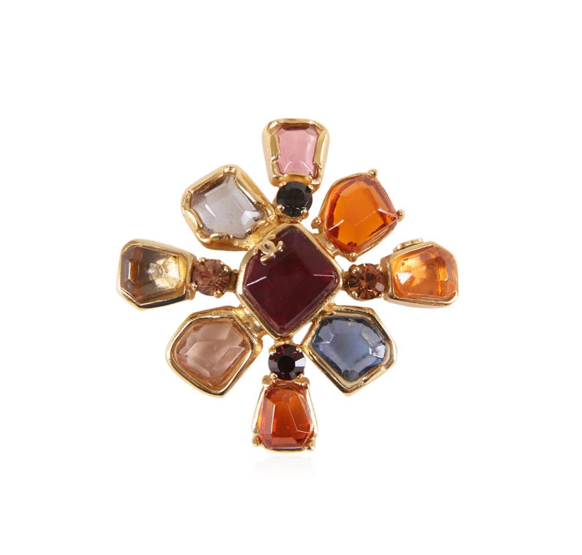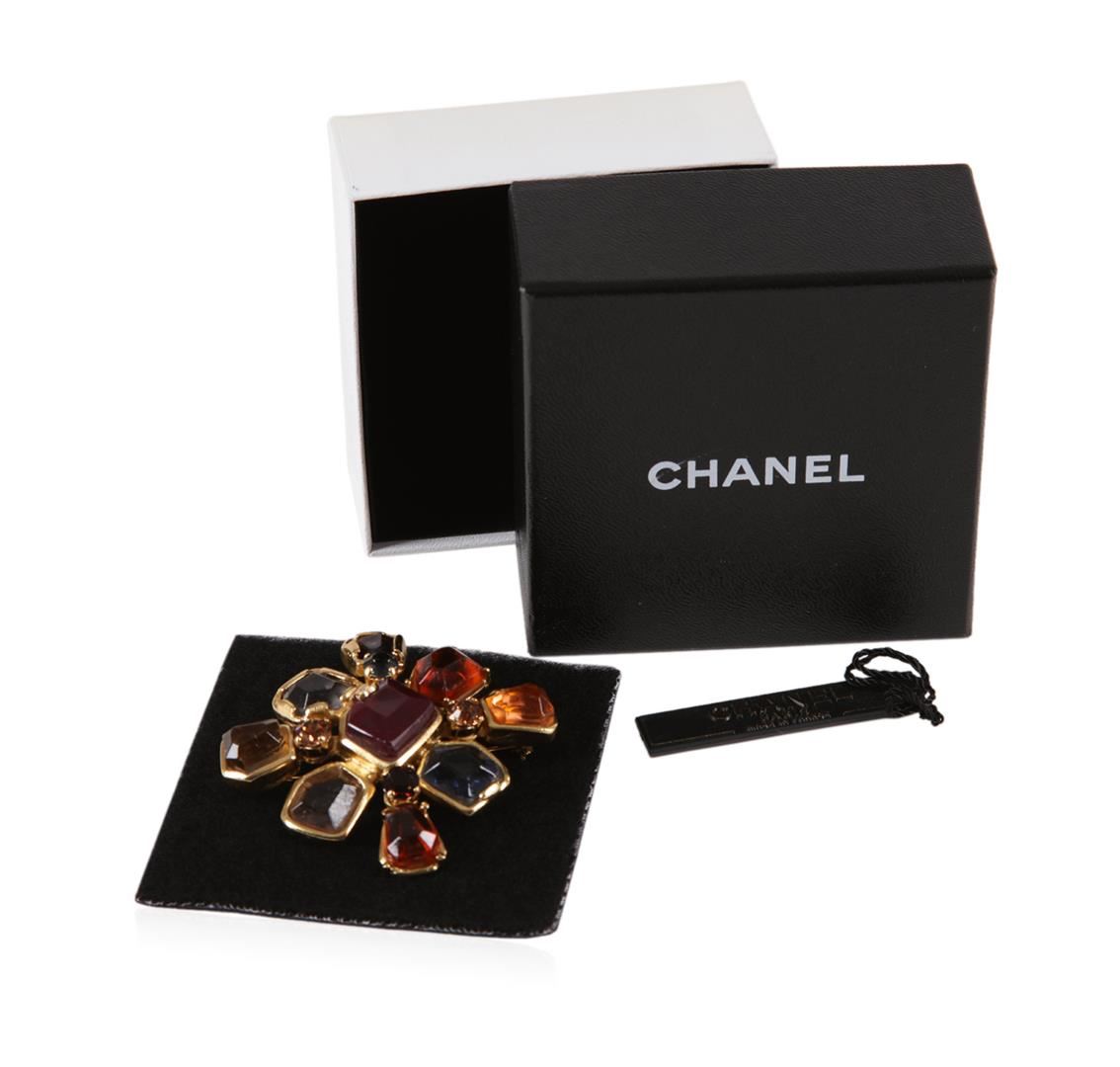 One Chanel multi-color brooch measuring approximately 1.75 by 2 inches. The brooch is in good condition and comes with a Chanel box.