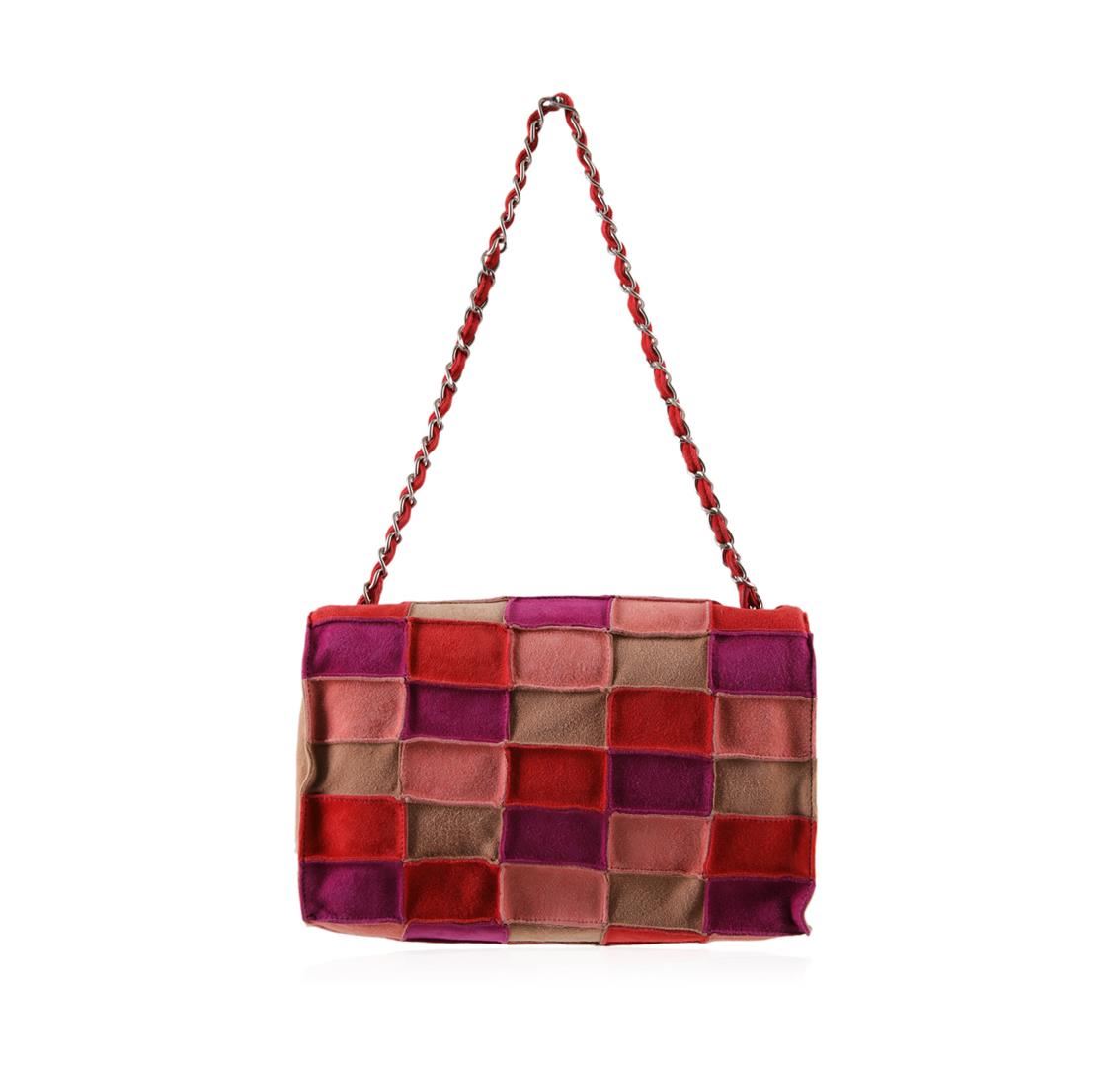 One Chanel multi-color leather bag with flap in good condition, measuring approximately 10 inches wide by 6.5 inches tall. Features a zippered pouch inside and comes with a Chanel drawstring cover bag, box, and card of authenticity.
