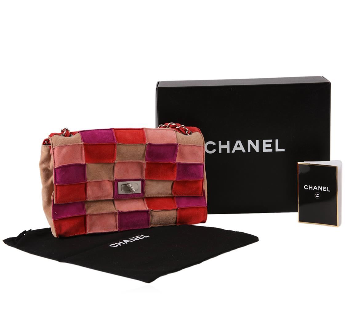 One Chanel multi-color leather bag with flap in good condition, measuring approximately 10 inches wide by 6.5 inches tall. Features a zippered pouch inside and comes with a Chanel drawstring cover bag, box, and card of authenticity.