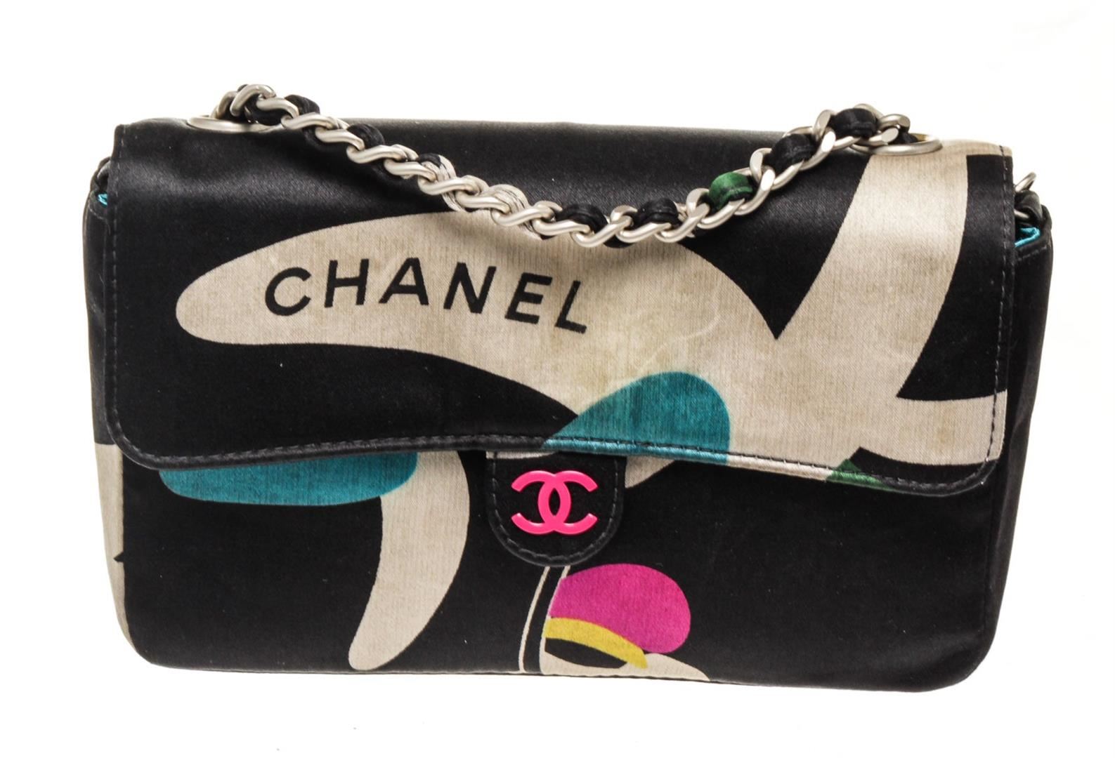 Chanel Multicolor Leather Print Mini Shoulder Bag with leather, silver-tone hardware, interior slip pockets, chain shoulder strap and snap closure.