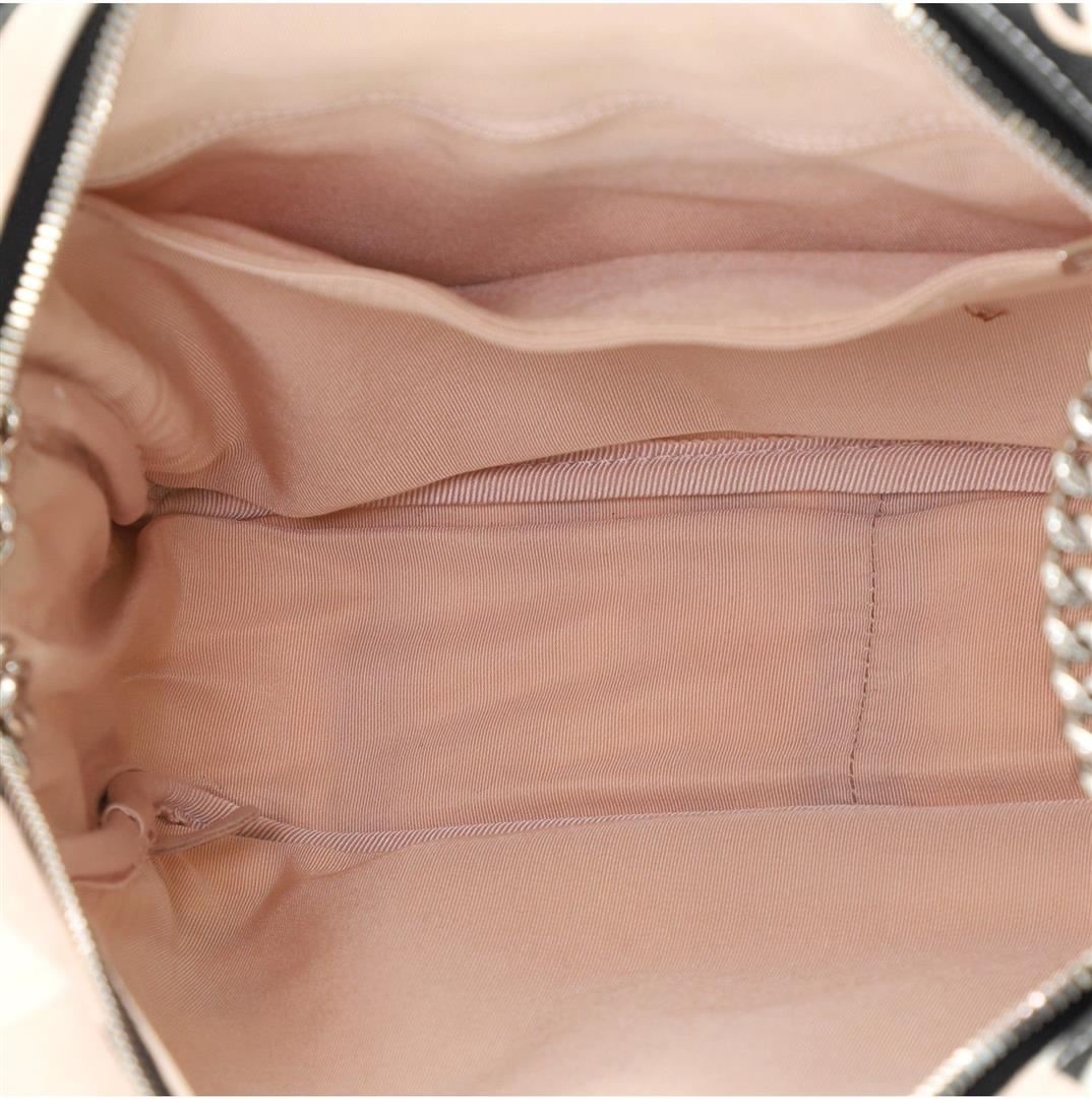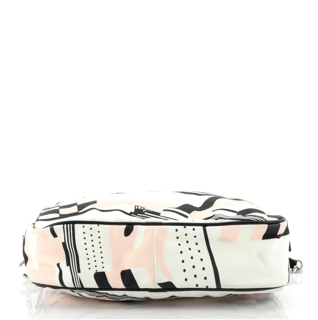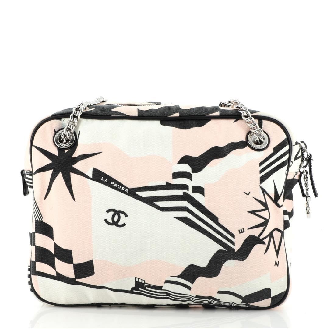 Chanel Multicolor Printed Canvas La Pausa Bay Small Camera Case Bag features pink, white, and black multicolor printed canvas, silver-tone hardware, interior slip pockets, chain shoulder strap, and zipper closure.