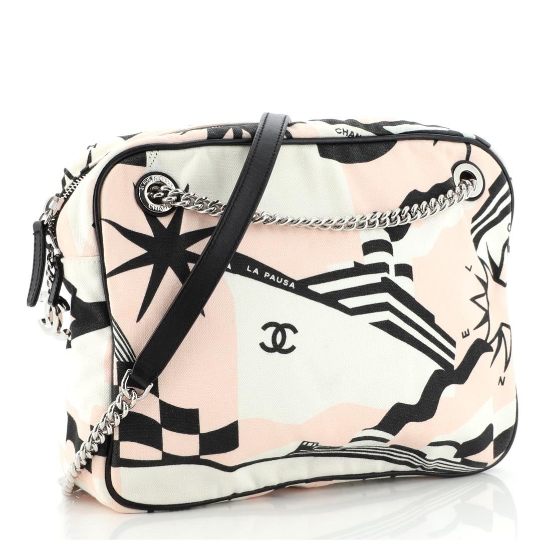 Chanel Multicolor Printed Canvas La Pausa Bay Small Camera Case Bag. Please see photos and description for all available information! Chanel Multicolor Printed Canvas La Pausa Bay Small Camera Case Bag features pink, white, and black multicolor printed ca