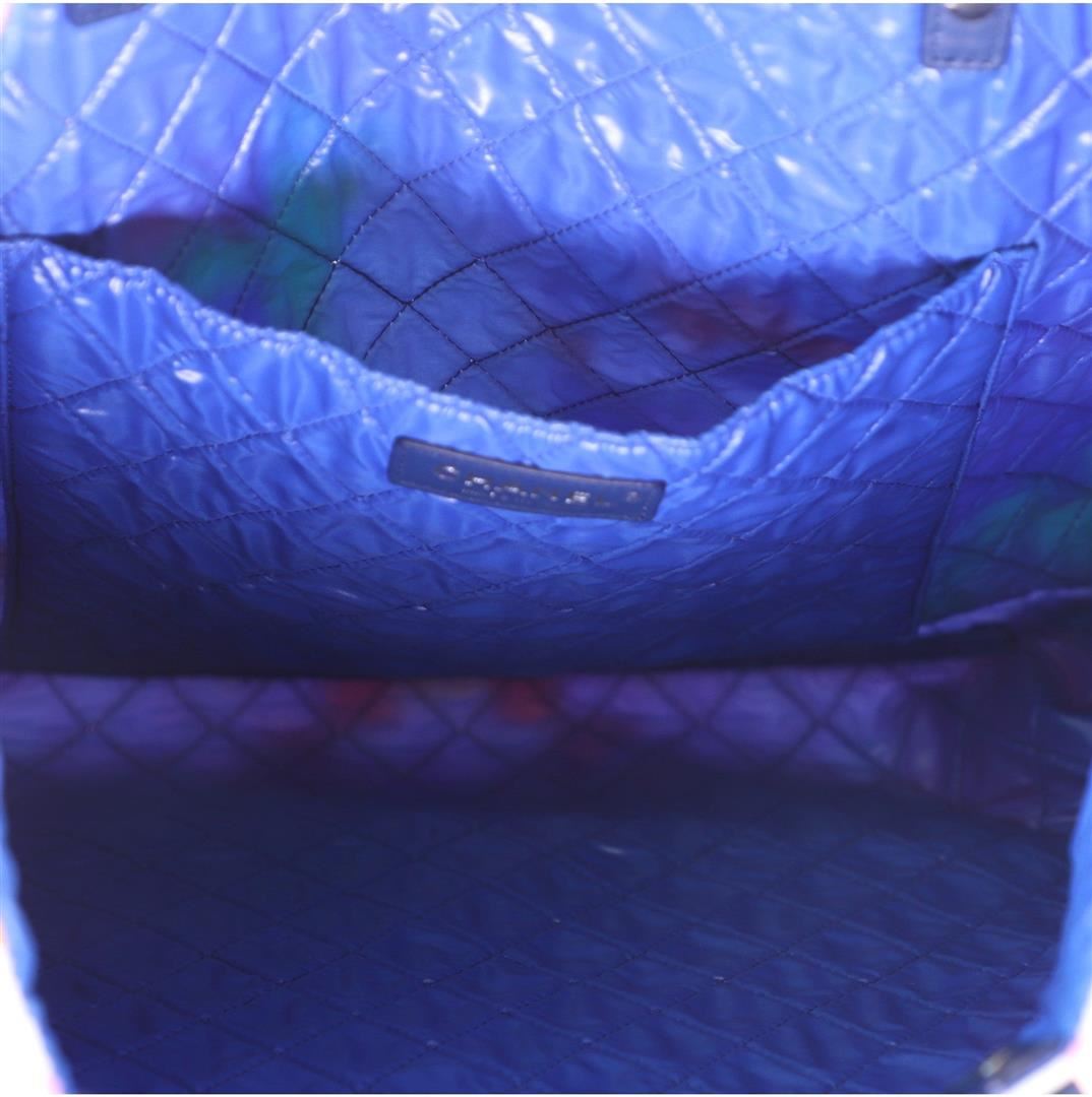 Chanel CC Medium Tote Bag features multicolor printed nylon with blue interlocking CC logo at the front, two navy blue leather straps with silver-tone studs as additional details, a detachable navy blue leather zipper pouch and blue nylon interior lining