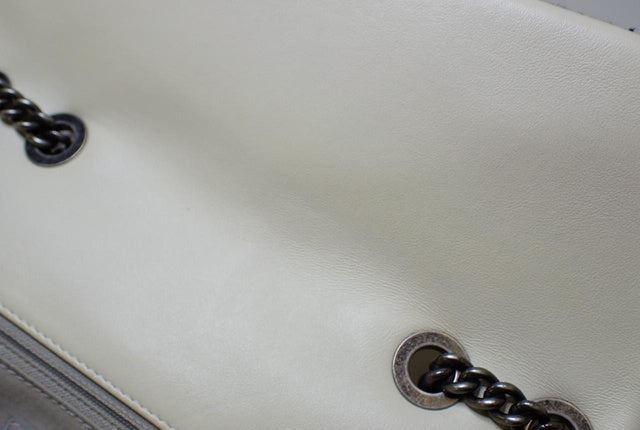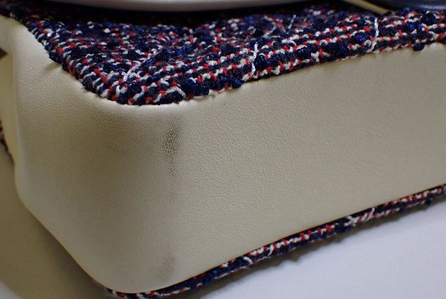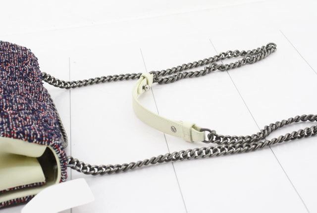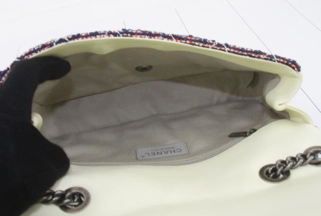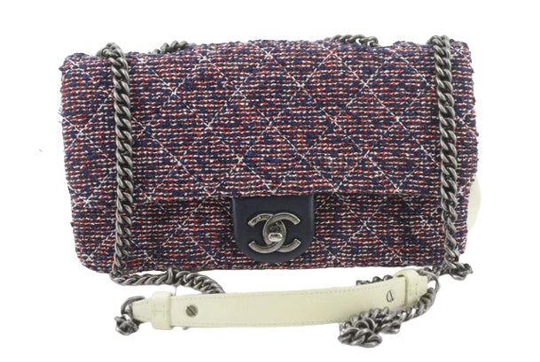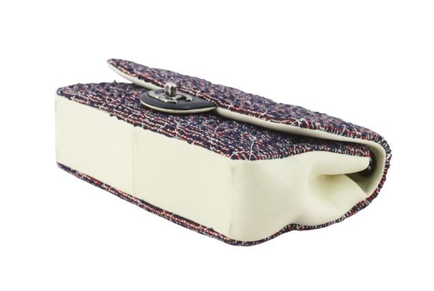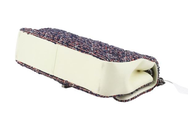 Red, blue and white quilted tweed Chanel Flap shoulder bag with silver-tone hardware, white leather trim, chain-link long shoulder strap with white leather pad, interlocking CC turn-lock at front flap that will open to white canvas-lined interior with one zipped pocket inside. Height: 8.5 in Width: 3.5 Base Length: 11.5 in