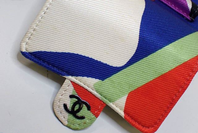 One Chanel Multicolor Satin Mini Messenger Pouch. Item is sold AS-IS. All available information is listed in the description and shown in the photo. Chanel Multicolor Satin Mini messenger pouch features a satin multicolor print with a belt loop on the back and has a detachable silve-tone chain strap that can be wornover your shoulder, a black interlocking CC logo at front and black fine textile lining. Length 3.75 in / 10 cm Width 1.25 in / 3 cm Height 3.5 in / 9 cm