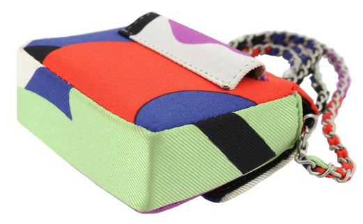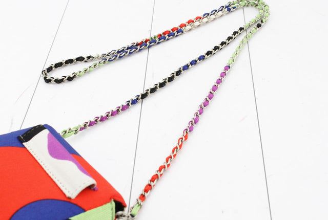 One Chanel Multicolor Satin Mini Messenger Pouch. Item is sold AS-IS. All available information is listed in the description and shown in the photo. Chanel Multicolor Satin Mini messenger pouch features a satin multicolor print with a belt loop on the back and has a detachable silve-tone chain strap that can be wornover your shoulder, a black interlocking CC logo at front and black fine textile lining. Length 3.75 in / 10 cm Width 1.25 in / 3 cm Height 3.5 in / 9 cm