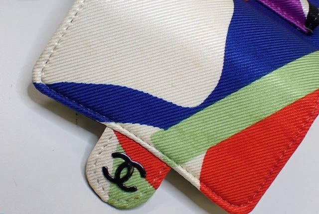 One Chanel Multicolor Satin Mini Messenger Pouch. Item is sold AS-IS. All available information is listed in the description and shown in the photo. Chanel Multicolor Satin Mini messenger pouch features a satin multicolor print with a belt loop on the back and has a detachable silve-tone chain strap that can be wornover your shoulder, a black interlocking CC logo at front and black fine textile lining.      Length 3.75 in / 10 cm Width 1.25 in / 3 cm Height 3.5 in / 9 cm
