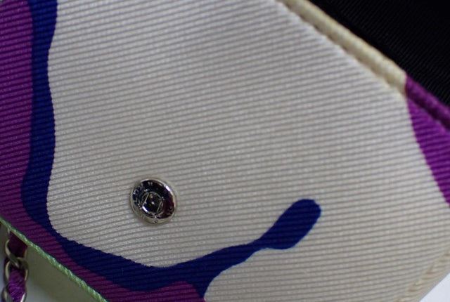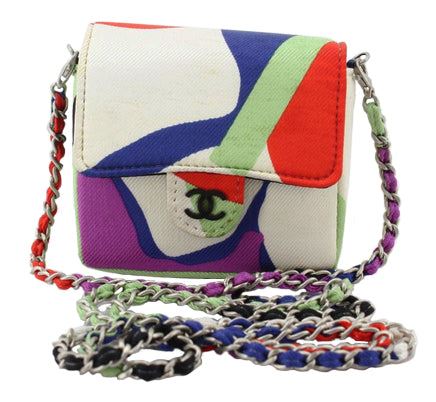 One Chanel Multicolor Satin Mini Messenger Pouch. Item is sold AS-IS. All available information is listed in the description and shown in the photo. Chanel Multicolor Satin Mini messenger pouch features a satin multicolor print with a belt loop on the back and has a detachable silve-tone chain strap that can be wornover your shoulder, a black interlocking CC logo at front and black fine textile lining. Length 3.75 in / 10 cm Width 1.25 in / 3 cm Height 3.5 in / 9 cm