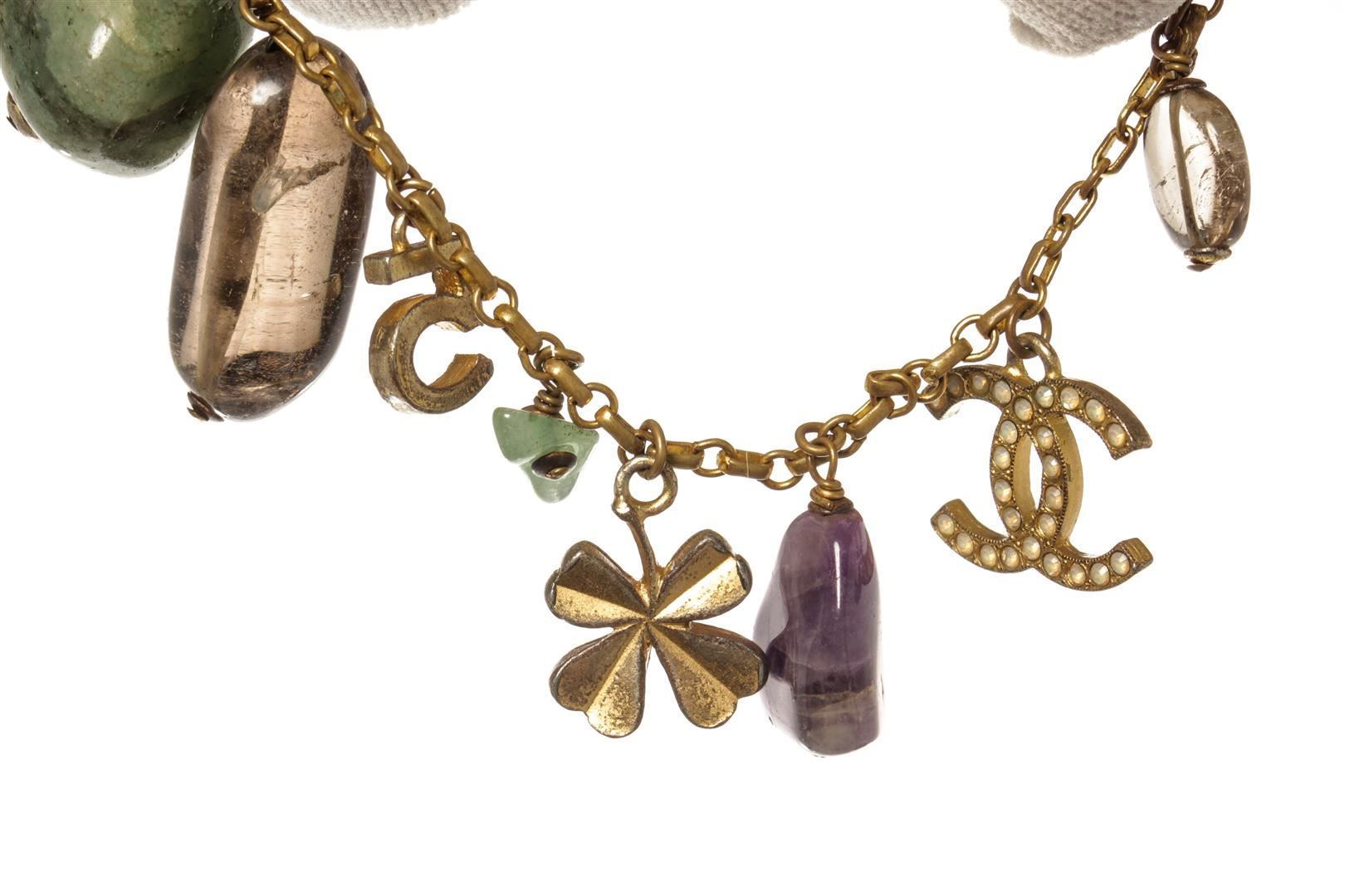 Chanel Multistone and Charm Bracelet. All available information is listed in the description and shown in the photos. Chanel Multistone and Charm Bracelet with gold plated charms and base, stones, and made in France. Circumference of 7.5 inches.