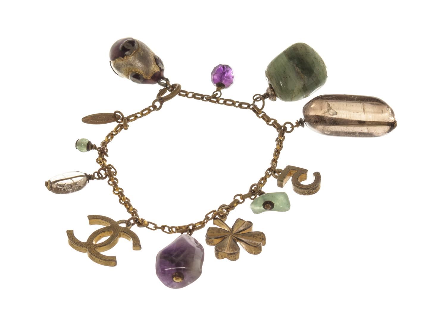 Chanel Multistone and Charm Bracelet. All available information is listed in the description and shown in the photos. Chanel Multistone and Charm Bracelet with gold plated charms and base, stones, and made in France. Circumference of 7.5 inches.
